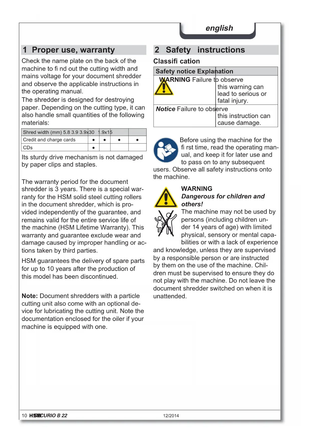 - RoHS-Richtlinie 2011/65/EU Die EU-Konformitätserklärung kann beim Hersteller angefordert werden.10 SECURIO B 22 12/2014 english 2 Safety instructions Classifi cation Safety notice Explanation WARNING Failure to observe this warning can lead to serious or fatal injury. Notice Failure to observe this instruction can cause damage. Before using the machine for the fi rst time, read the operating man- ual, and keep it for later use and to pass on to any subsequent users. Observe all safety instructions onto the machine. WARNING Dangerous for children and others! The machine may not be used by persons (including children un- der 14 years of age) with limited physical, sensory or mental capa- bilities or with a lack of experience and knowledge, unless they are supervised by a responsible person or are instructed by them on the use of the machine. Chil- dren must be supervised to ensure they do not play with the machine. Do not leave the document shredder switched on when it is unattended. 1 Proper use, warranty Check the name plate on the back of the machine to fi nd out the cutting width and mains voltage for your document shredder and observe the applicable instructions in the operating manual. The shredder is designed for destroying paper. Depending on the cutting type, it can also handle small quantities of the following materials: Shred width (mm) 5.8 3.9 3.9x30 1.9x15 Credit and charge cards ●● ● ● CDs ● Its sturdy drive mechanism is not damaged by paper clips and staples. Note: Document shredders with a particle cutting unit also come with an optional de- vice for lubricating the cutting unit. Note the documentation enclosed for the oiler if your machine is equipped with one. The warranty period for the document shredder is 3 years. There is a special war- ranty for the HSM solid steel cutting rollers in the document shredder, which is pro- vided independently of the guarantee, and remains valid for the entire service life of the machine (HSM Lifetime Warranty). This warranty and guarantee exclude wear and damage caused by improper handling or ac- tions taken by third parties. HSM guarantees the delivery of spare parts for up to 10 years after the production of this model has been discontinued.12/2014 SECURIO B 22 11 english WARNING Dangerous mains voltage! Improper handling of the machine can lead to an electric shock. – Before you insert the power plug, make sure that the voltage and frequency of your power supply comply with the infor- mation on the name plate. – Make sure that the power plug is easily accessible. – Make sure that no water gets into the shredder. Do not immerse the power ca- ble or the power plug in water. – Never touch the power plug with wet hands. – Never pull the plug out of the socket us- ing the power cable. Always pull out the plug directly. – Only use the machine in a dry room in- doors. Never operate the machine in damp rooms or in the rain. Check the machine and cable regularly for damage. Switch the shredder off if it is damaged or not working correctly or before relo- cating or cleaning it and disconnect it from the mains. – Keep the machine, the plug and cable away from open fi re and hot surfaces. The ventilation slots must not be blocked or covered and there must be at least 5 cm space between the shredder and any wall or furniture. Service work which requires the housing covers to be removed may only be carried out by HSM Customer Service and service technicians of our contractual partners. See page 160 for our customer service addresses. Notice Danger from improper use Only operate this machine in accordance with the instructions outlined in “Proper use”. WARNING Risk of injury! Do not reach into the paper feed slot. Risk of injury from being pulled in! Keep long hair, loose articles of clothing, ties, scarves, jewellery, etc. away from feed opening. Material with the tendency to form loops, e.g. tapes, strapping mate- rial, etc. must not be shredded. Danger of injury by splinters! Wear protective goggles when destroying CDs and hard credit cards.12 SECURIO B 22 12/2014 english 3 Machine components Operating and display elements Reverse buttonDisplay options:Container fullCutting unit blockedContainer openReady for operationOperation button 4 Scope of delivery Acces so ries