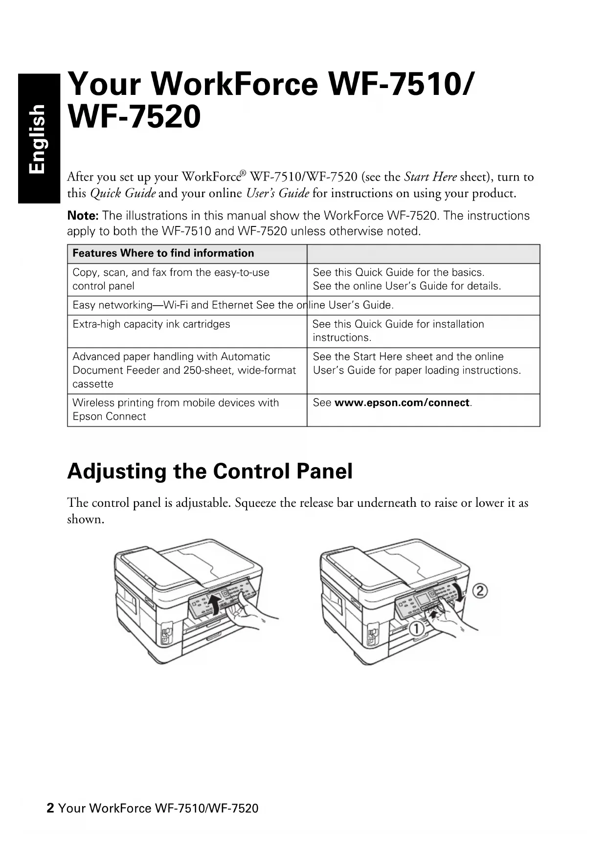 WF-7510/WF-7520 (see the Start Here sheet), turn to this Quick Guide and your online User’s Guide for instructions on using your product. Note: The illustrations in this manual show the WorkForce WF-7520. The instructions apply to both the WF-7510 and WF-7520 unless otherwise noted. Adjusting the Control Panel The control panel is adjustable. Squeeze the release bar underneath to raise or lower it as shown. Features Where to find informationCopy, scan, and fax from the easy-to-use control panel See this Quick Guide for the basics. See the online User’s Guide for details. Easy networking—Wi-Fi and Ethernet See the online User’s Guide. Extra-high capacity ink cartridges See this Quick Guide for installation instructions.Advanced paper handling with Automatic Document Feeder and 250-sheet, wide-format cassette See the Start Here sheet and the online User’s Guide for paper loading instructions.Wireless printing from mobile devices with Epson ConnectSee www.epson.com/connect. EnglishUsing the Control Panel 3 Using the Control Panel The control panel makes it easy to use all the features of your product. To save energy, the screen goes dark after several minutes of inactivity. Press any button to wake it up. Tip: To turn off the “beep” heard when you press a button on the screen, press Setup, select Printer Setup, select Sound, and select Off. If you turn off the sound, the dialing sound made when you transmit a fax is also turned off. Number Description 1 Turns product on/off 2 Press Photo to access the Print Photos menu 3 Press Copy to access your product’s Copy mode 4 View menus and status on the LCD Screen 5 Use the arrow keys and OK button to navigate menus 6 Enter numbers, letters, and symbols 7 Press Fax to access your product’s Fax mode 8 Press Scan to access your product’s Scan mode 9 Shows wireless network status 10 Resets the active menu selection to its default value