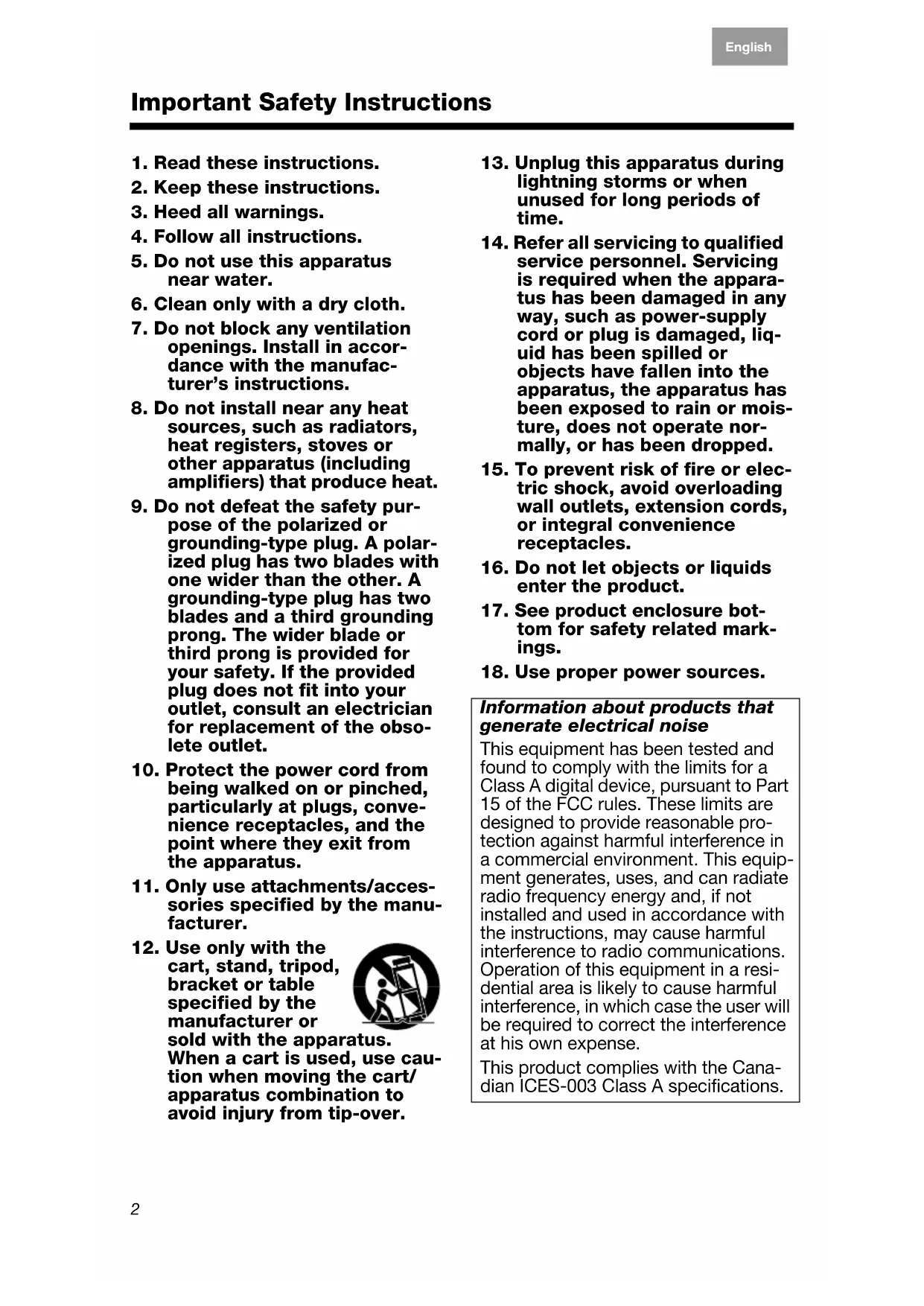 Information about products that generate electrical noise This equipment has been tested and found to comply with the limits for a Class A digital device, pursuant to Part 15 of the FCC rules. These limits are designed to provide reasonable pro- tection against harmful interference in a commercial environment. This equip- ment generates, uses, and can radiate radio frequency energy and, if not installed and used in accordance with the instructions, may cause harmful interference to radio communications. Operation of this equipment in a resi- dential area is likely to cause harmful interference, in which case the user will be required to correct the interference at his own expense. This product complies with the Cana- dian ICES-003 Class A specifications.3 English Deutsch FrançaisDansk Español Italiano SvenskaNederlands SAFETY INFORMATION Please read this owner’s guide Please take the time to follow the instructions in this owner’s guide carefully. It will help you set up and operate your system properly and enjoy its advanced features. Please save this owner’s guide for future reference.