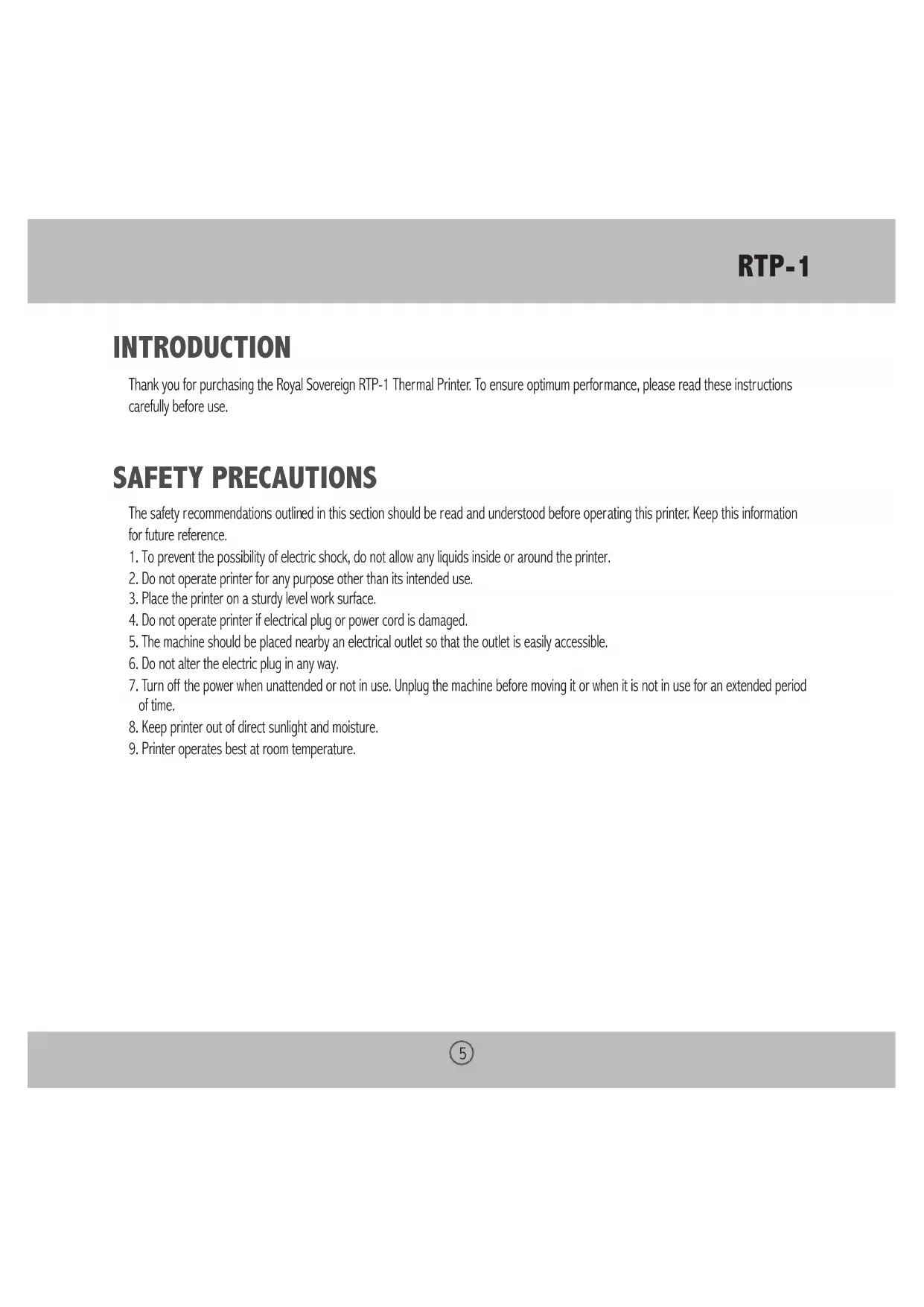 InTROduCTIOn Thank you for purchasing the Royal Sovereign RTP-1 Thermal Printer. To ensure optimum performance, please read these instructions carefully before use. SaFeTy PReCauTIOnS The safety recommendations outlined in this section should be read and understood before operating this printer. Keep this information for future reference.