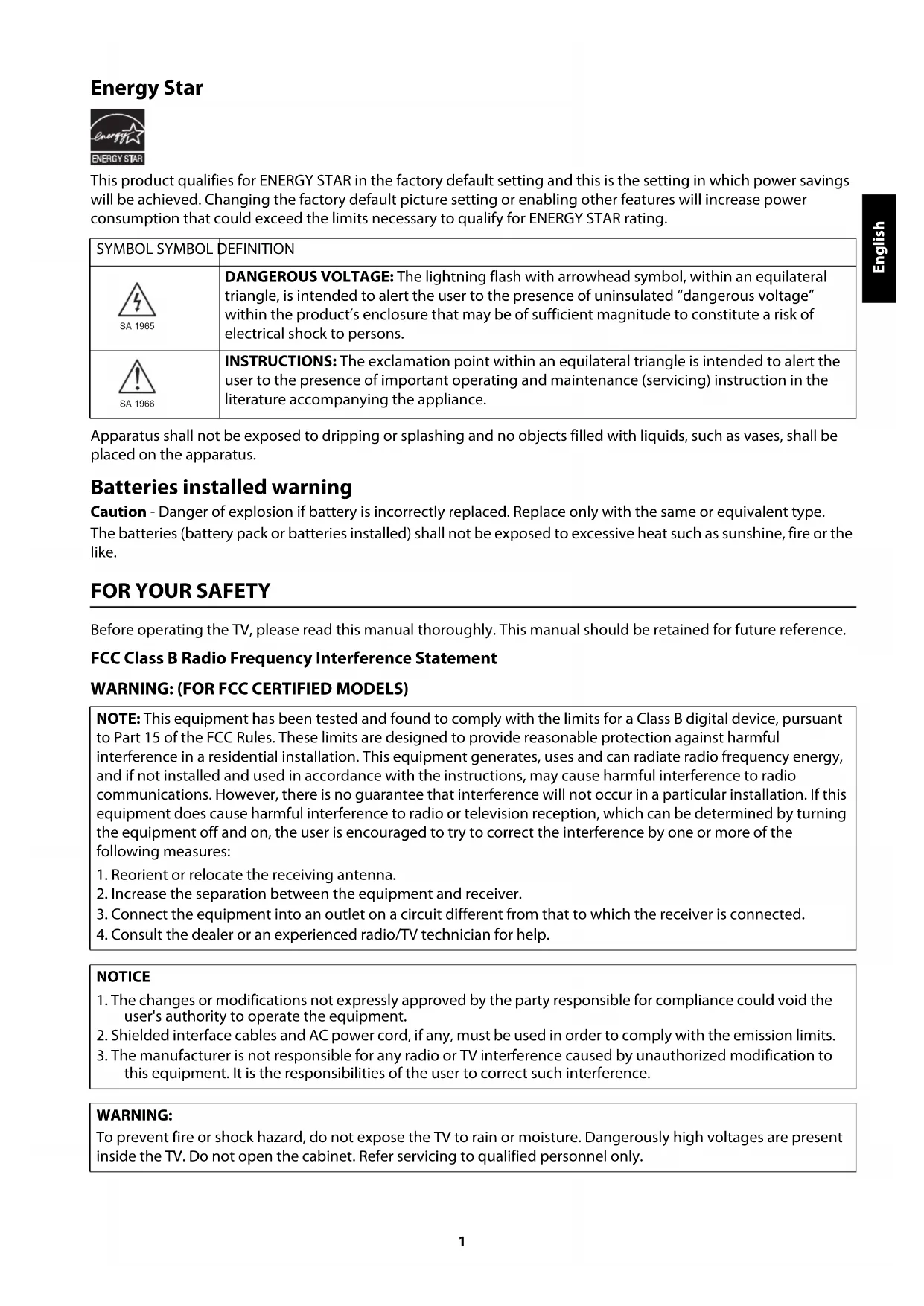 LED 32D30051 English Energy Star This product qualifies for ENERGY STAR in the factory default setting and this is the setting in which power savings will be achieved. Changing the factory default picture setting or enabling other features will increase power consumption that could exceed the limits necessary to qualify for ENERGY STAR rating. Apparatus shall not be exposed to dripping or splashing and no objects filled with liquids, such as vases, shall be placed on the apparatus. Batteries installed warning Caution - Danger of explosion if battery is incorrectly replaced. Replace only with the same or equivalent type. The batteries (battery pack or batteries installed) shall not be exposed to excessive heat such as sunshine, fire or the like.