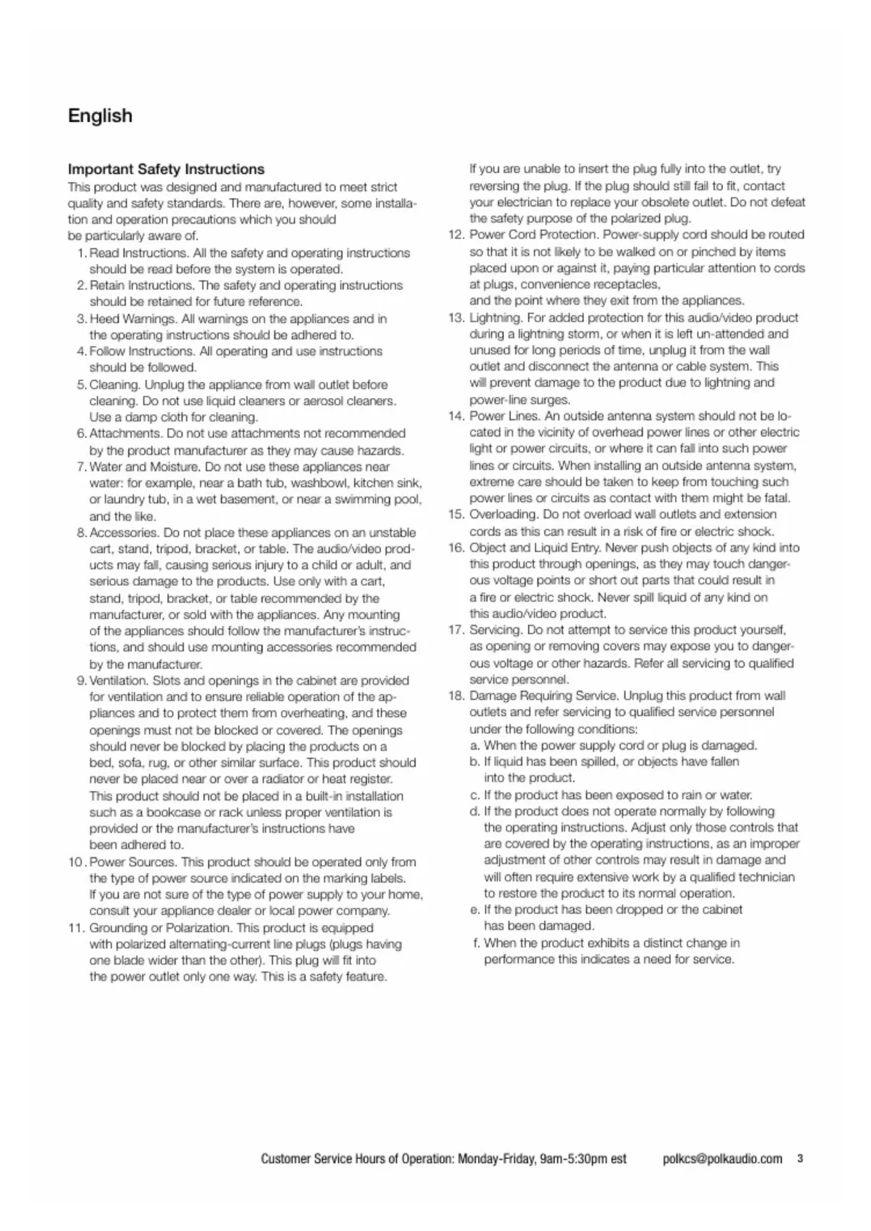 Customer Service Hours of Operation: Monday-Friday, 9am-5:30pm est polkcs@polkaudio.com Important Safety Instructions This product was designed and manufactured to meet strict quality and safety standards. There are, however, some installa