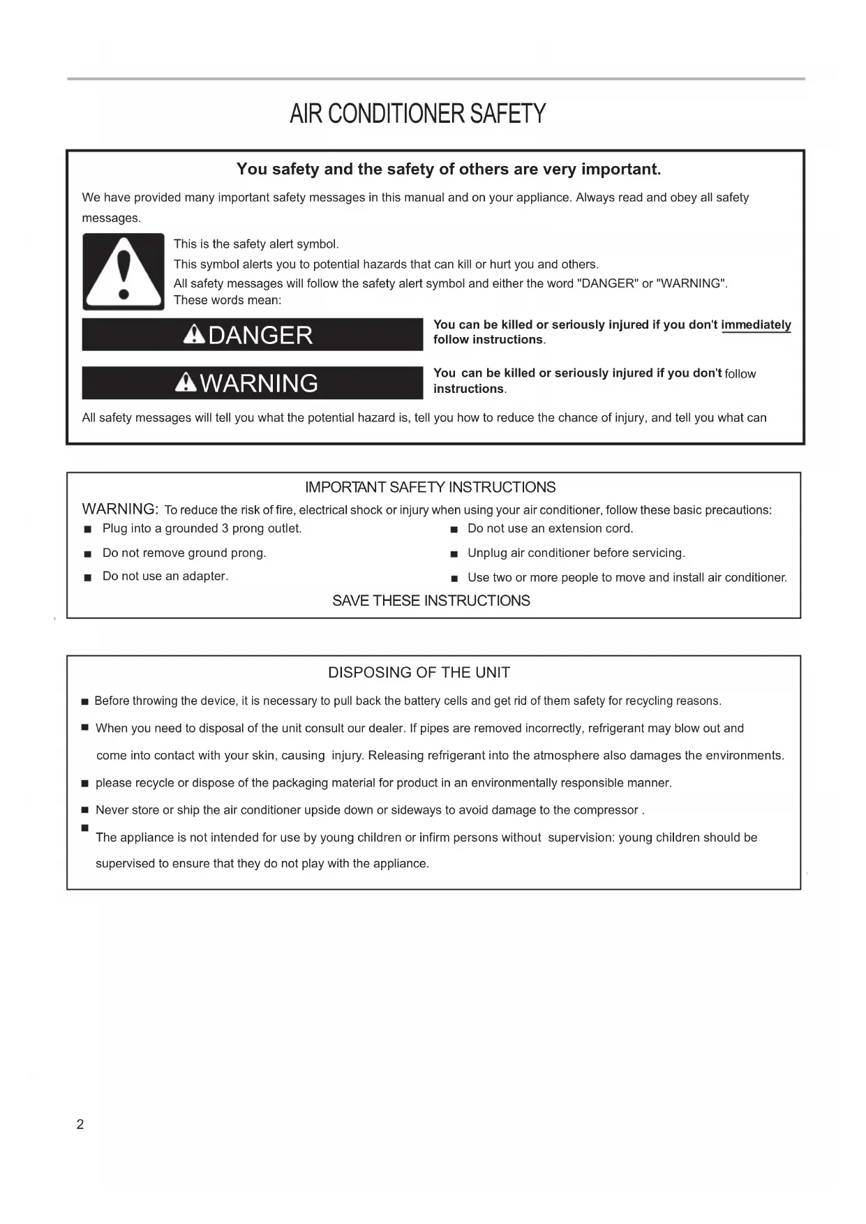 Unplug air conditioner before servicing. Use two or more people to move and install air conditioner. Plug into a grounded 3 prong outlet. Do not remove ground prong. Do not use an adapter. Do not use an extension cord. You safety and the safety of others are very important. Before throwing the device, it is necessary to pull back the battery cells and get rid of them safety for recycling reasons. When you need to disposal of the unit consult our dealer. If pipes are removed incorrectly, refrigerant may blow out andplease recycle or dispose of the packaging material for product in an environmentally responsible manner.Never store or ship the air conditioner upside down or sideways to avoid damage to the compressor . The appliance is not intended for use by young children or infirm persons without supervision: young children should be