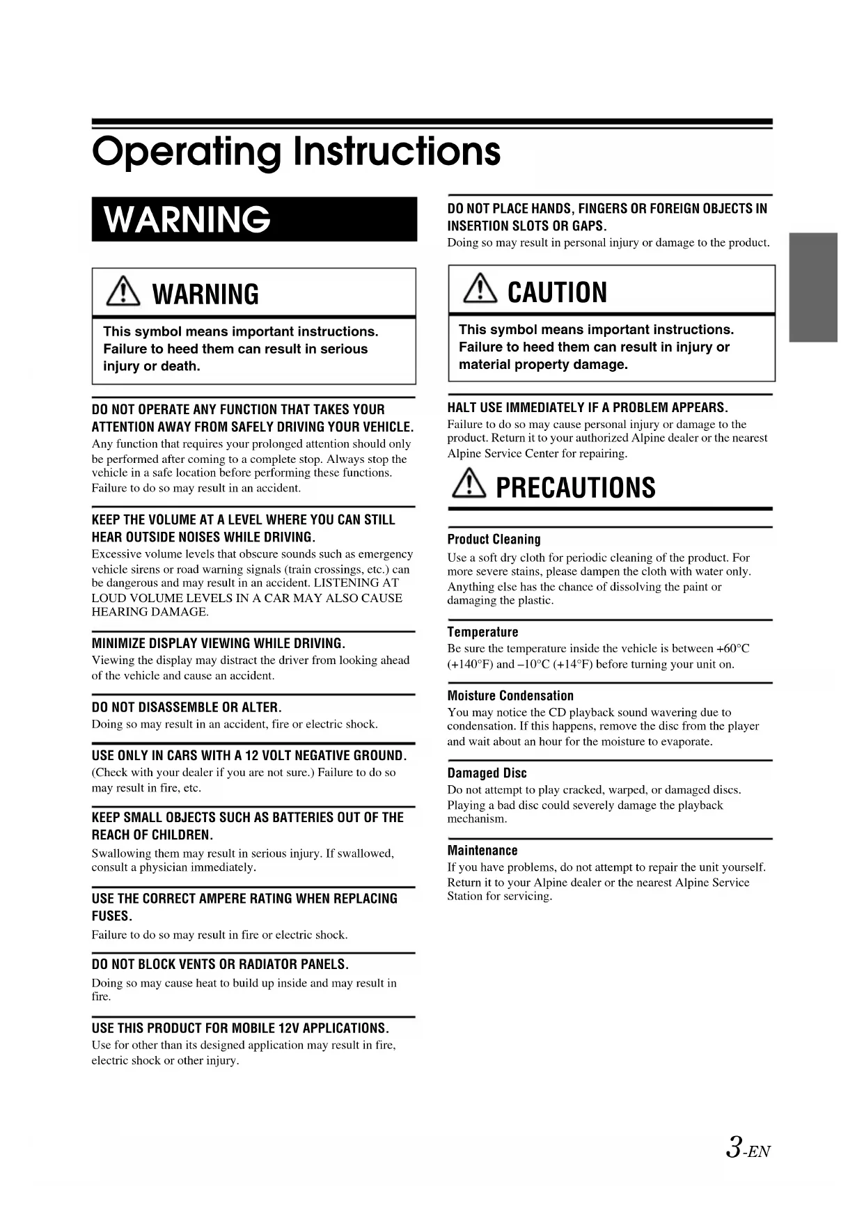 - Connections LIMITED WARRANTY 01GB00CDE121.book Page 2 Monday, December 13, 2010 2:03 PM3-EN 01GB03CDE121.fm ALPINE CDE-121 68-16909Z79-A (EN) Operating Instructions DO NOT OPERATE ANY FUNCTION THAT TAKES YOUR ATTENTION AWAY FROM SAFELY DRIVING YOUR VEHICLE. Any function that requires your prolonged attention should only be performed after coming to a complete stop. Always stop the vehicle in a safe location before performing these functions. Failure to do so may result in an accident.KEEP THE VOLUME AT A LEVEL WHERE YOU CAN STILL HEAR OUTSIDE NOISES WHILE DRIVING.Excessive volume levels that obscure sounds such as emergency vehicle sirens or road warning signals (train crossings, etc.) can be dangerous and may result in an accident. LISTENING AT LOUD VOLUME LEVELS IN A CAR MAY ALSO CAUSE HEARING DAMAGE.MINIMIZE DISPLAY VIEWING WHILE DRIVING.Viewing the display may distract the driver from looking ahead of the vehicle and cause an accident.DO NOT DISASSEMBLE OR ALTER.Doing so may result in an accident, fire or electric shock.USE ONLY IN CARS WITH A 12 VOLT NEGATIVE GROUND. (Check with your dealer if you are not sure.) Failure to do so may result in fire, etc.KEEP SMALL OBJECTS SUCH AS BATTERIES OUT OF THE REACH OF CHILDREN. Swallowing them may result in serious injury. If swallowed, consult a physician immediately.USE THE CORRECT AMPERE RATING WHEN REPLACING FUSES. Failure to do so may result in fire or electric shock.DO NOT BLOCK VENTS OR RADIATOR PANELS. Doing so may cause heat to build up inside and may result in fire.USE THIS PRODUCT FOR MOBILE 12V APPLICATIONS. Use for other than its designed application may result in fire, electric shock or other injury.DO NOT PLACE HANDS, FINGERS OR FOREIGN OBJECTS IN INSERTION SLOTS OR GAPS. Doing so may result in personal injury or damage to the product.HALT USE IMMEDIATELY IF A PROBLEM APPEARS. Failure to do so may cause personal injury or damage to the product. Return it to your authorized Alpine dealer or the nearest Alpine Service Center for repairing. PRECAUTIONS Product CleaningUse a soft dry cloth for periodic cleaning of the product. For more severe stains, please dampen the cloth with water only. Anything else has the chance of dissolving the paint or damaging the plastic.TemperatureBe sure the temperature inside the vehicle is between +60°C (+140°F) and –10°C (+14°F) before turning your unit on.Moisture CondensationYou may notice the CD playback sound wavering due to condensation. If this happens, remove the disc from the player and wait about an hour for the moisture to evaporate.Damaged DiscDo not attempt to play cracked, warped, or damaged discs. Playing a bad disc could severely damage the playback mechanism.MaintenanceIf you have problems, do not attempt to repair the unit yourself. Return it to your Alpine dealer or the nearest Alpine Service Station for servicing. WARNING WARNING This symbol means important instructions. Failure to heed them can result in serious injury or death. CAUTION This symbol means important instructions. Failure to heed them can result in injury or material property damage. 01GB00CDE121.book Page 3 Monday, December 13, 2010 2:03 PM4-EN 01GB03CDE121.fm ALPINE CDE-121 68-16909Z79-A (EN) Never Attempt the Following Do not grip or pull out the disc while it is being pulled back into the player by the automatic reloading mechanism. Do not attempt to insert a disc into the unit when the unit power is off. Inserting Discs Your player accepts only one disc at a time for playback. Do not attempt to load more than one disc. Make sure the label side is facing up when you insert the disc. “ERROR” will be displayed on your player if you insert a disc incorrectly. Playing a disc while driving on a very bumpy road may result in skips, but this will not scratch the disc or damage the player. New Discs To prevent the CD from jamming, “ERROR” is displayed if discs with irregular surfaces are inserted or if discs are inserted incorrectly. When a new disc is ejected immediately after initial loading, use your finger to feel around the inside of the center hole and outside edge of the disc. If you feel any small bumps or irregularities, this could inhibit proper loading of the disc. To remove the bumps, rub the inside edge of the hole and outside edge of the disc with a ballpoint pen or other such instrument, then insert the disc again. Irregular Shaped Discs Be sure to use round shape discs only for this unit and never use any special shape discs. Use of special shape discs may cause damage to the mechanism. Installation Location Make sure this unit will not be installed in a location subjected to: p. 28