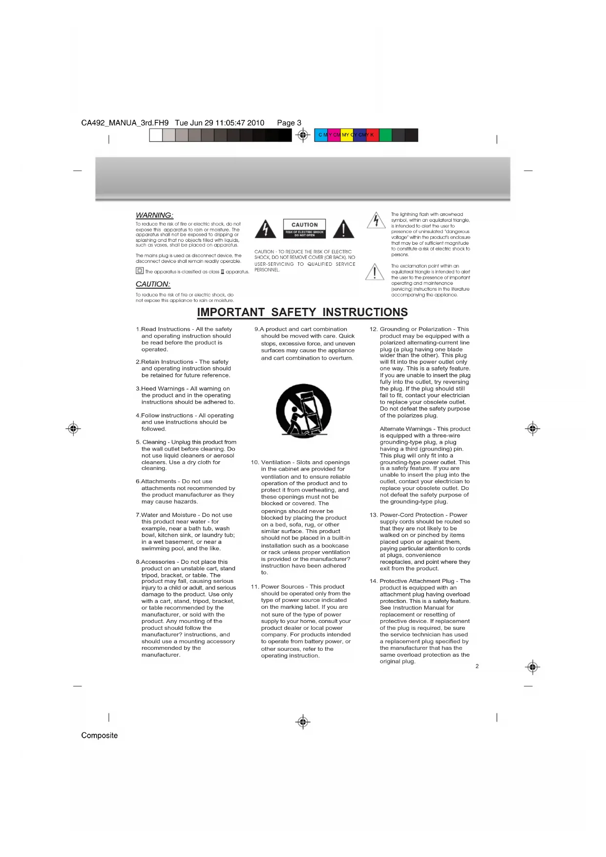 PERSONNEL. The exclamation point within an equilateral triangle is intended to alert the user to the presence of important operating and maintenance (servicing) instructions in the literature accompanying the appliance. CAUTION: To reduce the risk of fire or electric shock, do not expose this appliance to rain or moisture.CA492_MANUA_3rd.FH9 Tue Jun 29 11:05:47 2010 Page 4 Composite C M Y CM MY CY CMY K
