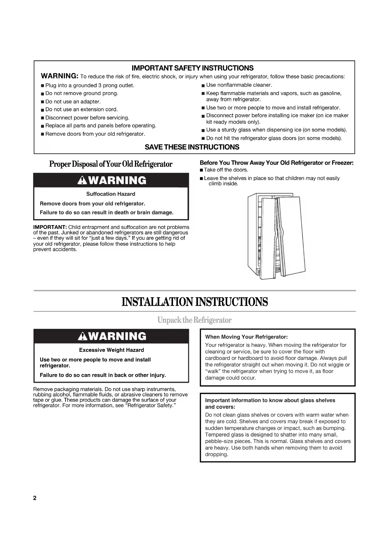 W10321485AYou can be killed or seriously injured if you don't immediately You can be killed or seriously injured if you don'tfollow All safety messages will tell you what the potential hazard is, tell you how to reduce the chance of injury, and tell you what can happen if the instructions are not followed. Your safety and the safety of others are very important. We have provided many important safety messages in this manual and on your appliance. Always read and obey all safety messages.This is the safety alert symbol.This symbol alerts you to potential hazards that can kill or hurt you and others.All safety messages will follow the safety alert symbol and either the word “DANGER” or “WARNING.”These words mean:follow instructions.instructions. DANGER WARNING2 INSTALLATION INSTRUCTIONS Unpack the Refrigerator Remove packaging materials. Do not use sharp instruments, rubbing alcohol, flammable fluids, or abrasive cleaners to remove tape or glue. These products can damage the surface of your refrigerator. For more information, see “Refrigerator Safety.” Proper Disposal of Your Old Refrigerator IMPORTANT: Child entrapment and suffocation are not problems of the past. Junked or abandoned refrigerators are still dangerous – even if they will sit for “just a few days.” If you are getting rid of your old refrigerator, please follow these instructions to help prevent accidents.Before You Throw Away Your Old Refrigerator or Freezer:■ Take off the doors.■ Leave the shelves in place so that children may not easily climb inside.
