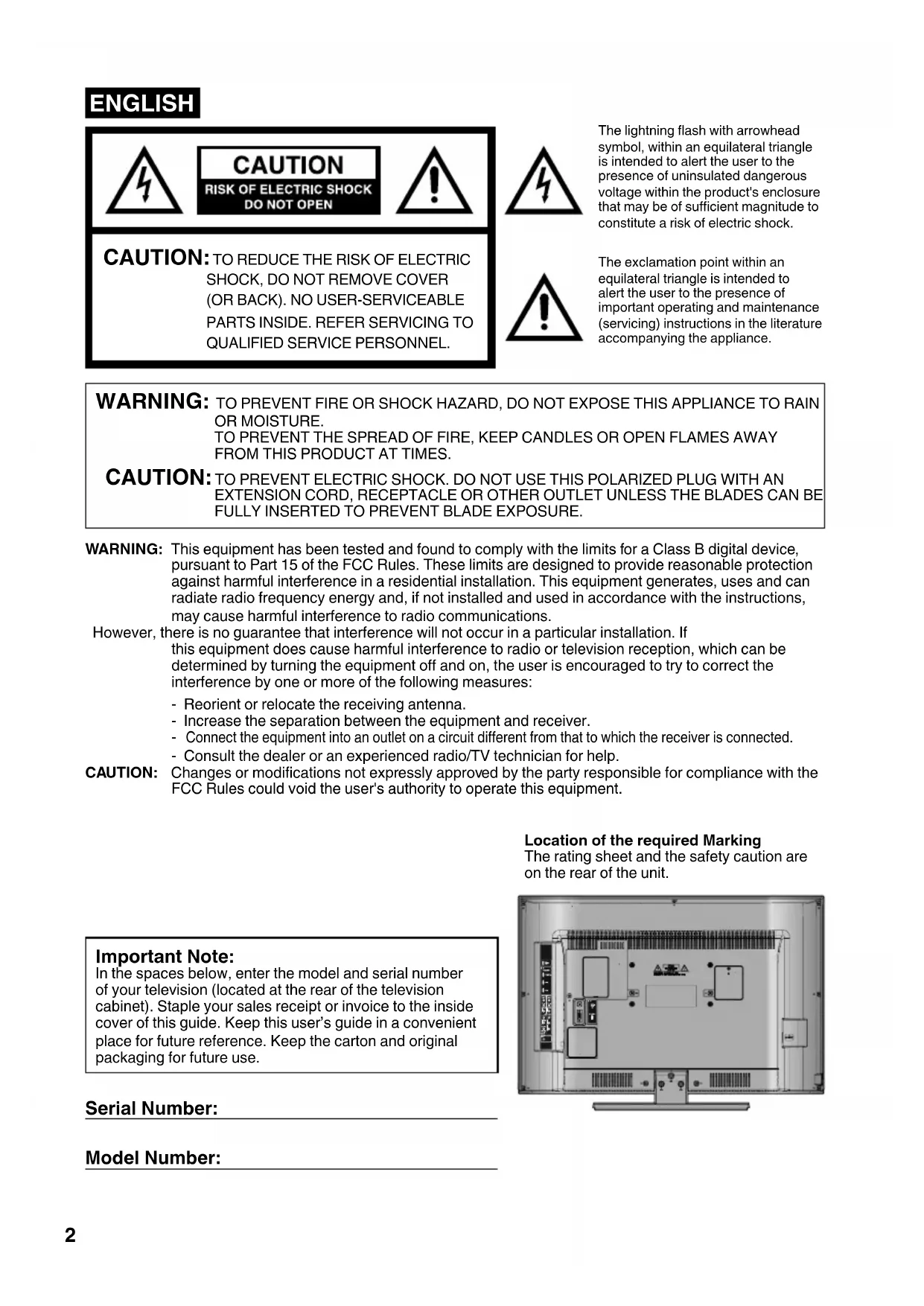 OR MOISTURE. TO PREVENT THE SPREAD OF FIRE, KEEP CANDLES OR OPEN FLAMES AWAY FROM THIS PRODUCT AT TIMES. CAUTION: TO PREVENT ELECTRIC SHOCK. DO NOT USE THIS POLARIZED PLUG WITH AN EXTENSION CORD, RECEPTACLE OR OTHER OUTLET UNLESS THE BLADES CAN BE FULLY INSERTED TO PREVENT BLADE EXPOSURE. Important Note: In the spaces below, enter the model and serial number of your television (located at the rear of the television cabinet). Staple your sales receipt or invoice to the inside cover of this guide. Keep this user’s guide in a convenient place for future reference. Keep the carton and original packaging for future use. Serial Number: Model Number: 3CN0521A_En.indd 23CN0521A_En.indd 2 9/15/10 1:48:50 PM9/15/10 1:48:50 PM3 ENGLISH