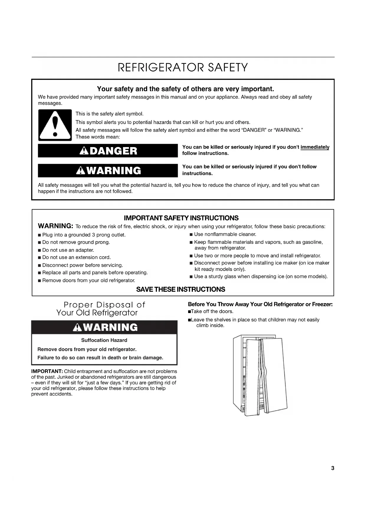 Accessoires .................................................................................. 58 FEUILLES DE DONNÉES SUR LE PRODUIT ............................... 59 GARANTIE ....................................................................................... 603 REFRIGERATOR SAFETY Proper Disposal of Your Old Refrigerator IMPORTANT: Child entrapment and suffocation are not problems of the past. Junked or abandoned refrigerators are still dangerous – even if they will sit for “just a few days.” If you are getting rid of your old refrigerator, please follow these instructions to help prevent accidents.Before You Throw Away Your Old Refrigerator or Freezer:■ Take off the doors.■ Leave the shelves in place so that children may not easily climb inside.You can be killed or seriously injured if you don't immediately You can be killed or seriously injured if you don'tfollow All safety messages will tell you what the potential hazard is, tell you how to reduce the chance of injury, and tell you what can happen if the instructions are not followed. Your safety and the safety of others are very important. We have provided many important safety messages in this manual and on your appliance. Always read and obey all safety messages.This is the safety alert symbol.This symbol alerts you to potential hazards that can kill or hurt you and others.All safety messages will follow the safety alert symbol and either the word “DANGER” or “WARNING.”These words mean:follow instructions.instructions. DANGER WARNING