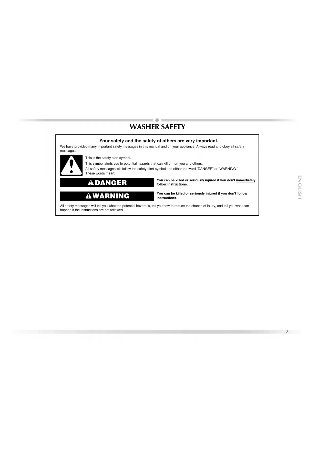 Aux États-Unis..................................................................78 Au Canada.......................................................................78 GARANTIE ..........................................................................793 WASHER SAFETY You can be killed or seriously injured if you don't immediately You can be killed or seriously injured if you don'tfollow All safety messages will tell you what the potential hazard is, tell you how to reduce the chance of injury, and tell you what can happen if the instructions are not followed. Your safety and the safety of others are very important. We have provided many important safety messages in this manual and on your appliance. Always read and obey all safety messages.This is the safety alert symbol.This symbol alerts you to potential hazards that can kill or hurt you and others.All safety messages will follow the safety alert symbol and either the word “DANGER” or “WARNING.”These words mean:follow instructions.instructions. DANGER WARNING4 INSTALLATION REQUIREMENTS Tools and Parts Gather the required tools and parts before starting installation. The parts supplied are in the washer drum. Tools needed for connecting the water inlet hoses ■ Pliers (that open to 1⁹⁄₁₆"[39.5mm]) ■ Flashlight (optional)Tools needed for installation■ Open end wrenches 17 mm and 13 mm■ Level■ Wood block■ Ruler or measuring tape