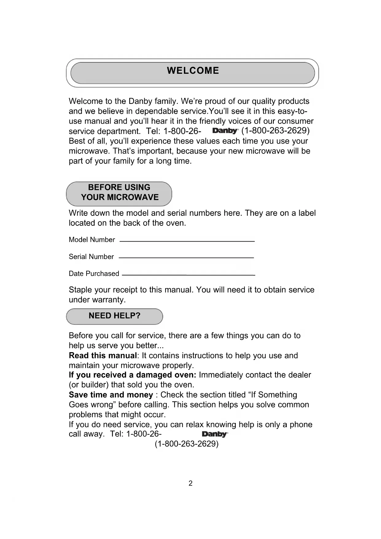 HELPFUL HINTS Open the oven door a few minutes after cooking to air out the inside. An occasional thorough wiping with a solution of baking soda and water keeps the inside fresh. NOTE: Be certain the power is off before cleaning any part of this oven. HOW TO CLEAN THE INSIDE Walls, Floor, Inside Window, Metal and Plastic Parts on the Door: Some spatters can be removed with a paper towel, while others may require a damp cloth. Remove greasy spatters with a sudsy cloth, then rinse with a damp cloth. DO NOT use abrasive cleaners or sharp utensils on the oven walls. Never use a commercial oven cleaner on any part of your microwave. Removable Turntable and Turntable Support: To prevent breakage, do not place the turntable into water just after cooking. Wash it carefully in warm, sudsy water or in the dishwasher. The turntable and support can be broken if dropped. Remember, do not operate the oven without the turntable and support in place. HOW TO CLEAN THE OUTSIDE DO NOT use cleaners containing ammonia or alcohol on the microwave oven. Ammonia or alcohol can damage the appearance of the microwave. Outer Case: Clean the outside of the microwave with a sudsy cloth. Rinse and dry. Wipe the window clean with a damp cloth. Control Panel and Door: Wipe with a damp cloth and dry thoroughly. Do not use cleaning sprays, large amounts of soap and water, abrasive or sharp objects on the panel- they may damage it. Some paper towels can also scratch the control panel. Door Surface: It is important to keep the area clean where the door seals against the microwave. Use only mild, non-abrasive detergents applied with a clean sponge or soft cloth. Rinse well. TROUBLESHOOTING Before You Call For Service: If none of the below suggestions rectify the situation, contact our customer care department at 1-800-26- DANBY (1-800-263-2629) Problem Possible Cause What To Do Oven will not start A fuse may be blown, or the Replace fuse or reset the circuit breaker tripped. circuit breaker. Microwave door is not closed Close door securely. Power surge. Unplug, then re-plug in the microwave. appears on The control has been locked. Press and hold STOP/Clear display. for about 3 seconds to unlock the control. THINGS THAT ARE NORMAL: