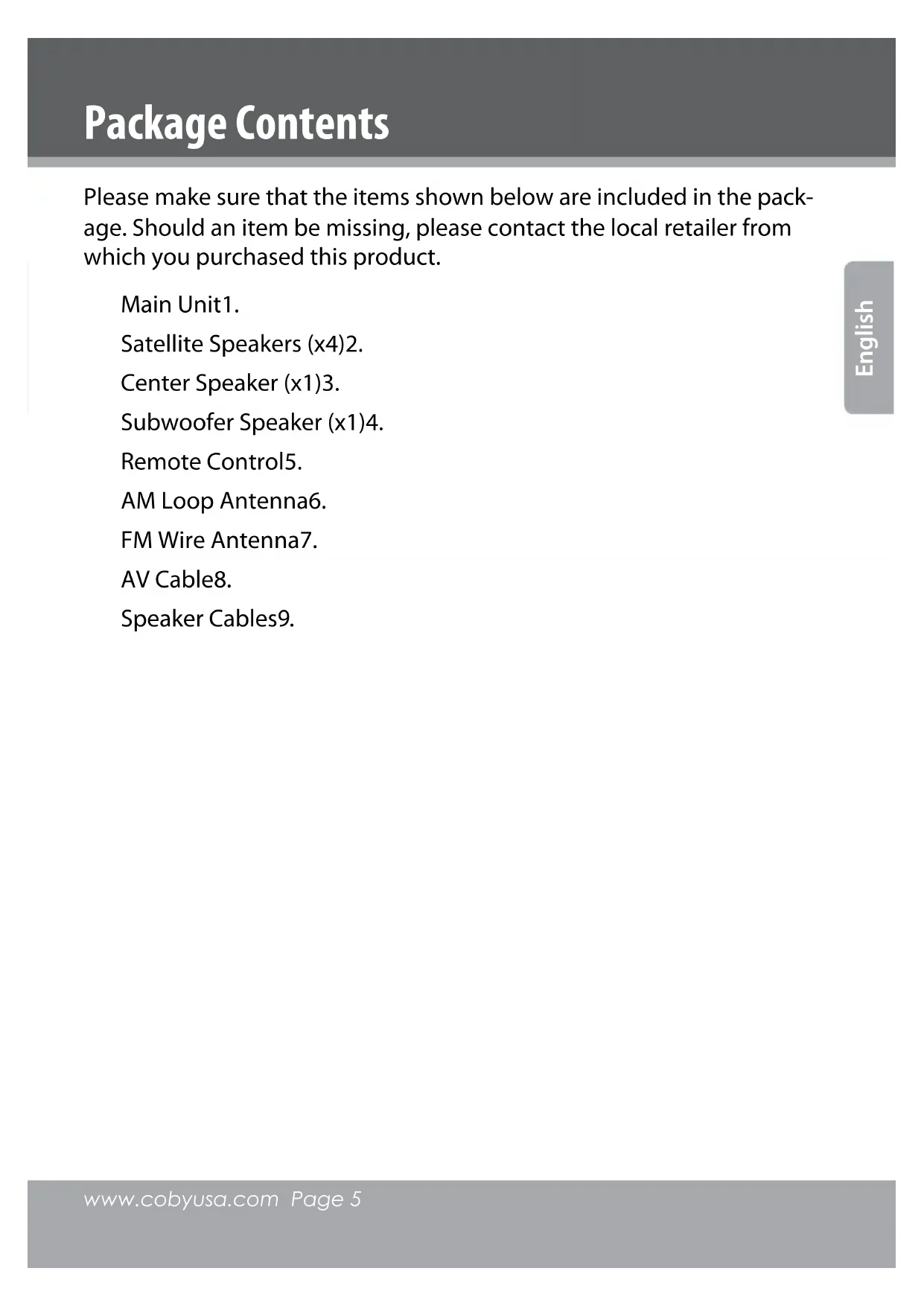 &+$XGLR2XWSXW&+$XGLR,QSXWPage 20 Coby Electronics Corporation English Connections Speakers This unit has an integrated amplier. Connect the supplied speakers to enjoy your movies with .-channel surround sound! If necessary, strip 3/8” (10 mm) of insulation from each end of the 1. speaker wire. While pressing the terminal levers of each speaker, insert the bare 2. wire into the hole, then release the lever to secure the connection. While pressing the speaker terminal levers of the unit, insert the bare 3. wire into the hole, then release the lever to secure the connection. The speaker wire and terminal for each speaker is color-coded for 4. your convenience. The following table will help you match the speakers to their proper terminal: Terminal Speaker Color SW Subwoofer Green CEN Center Red SR Surround Right Blue SL Surround Left Yellow FR Front Right Gray FL Front Left White Make sure that the terminals are connected to the bare wires and not the insulation. Always match colored positive (+) termi- nals together; and match black negative (-) terminals together. If switched, the sound will be out of phase and will not be produced correctly. Do not connect more than one wire to each speaker ter- minal; do not connect one speaker to several terminals.www.cobyusa.com Page 21 English Connections RCA Stereo Audio Out (Optional, Standard) For use with an external amplier/audio system. Using the supplied AV cable: Connect one end of the white and red cables to the white and red 1. Audio Out jacks of the unit (L, R). Connect the other end of the white and red cables to the white and 2. red Audio In jacks of an external audio system. Please refer to the documentation included with your external audio system for further help using this connection. Coaxial Digital Audio Out (Optional, Best) For use with a digital decoding external amplier/audio system. Using an optional coaxial digital audio cable: Connect one end of the coaxial cable to the black Digital Audio Out 1. jack of the unit. Connect the other end of the coaxial cable to the Digital Audio In 2. jack of an external audio system. Please refer to the documentation included with your external audio system for further help using this connection.Page 22 Coby Electronics Corporation English Connections Stereo Line Input For use with an external playback device with stereo audio output (e.g., a VCR, MP, or CD player). Using an optional RCA stereo audio patch cable: Connect one end of the white and 1. red cables to the white and red Line Input jacks of the unit (L, R). Connect the other end of the cable 2. to the output jack(s) of an external audio playback device. After this connection has been made, press <SOURCE> on the remote to switch to “LINE” mode to enjoy audio from the external device. Depending on the type of patch cable used, you can use this connection with external devices with a 3.5mm stereo output jack or RCA stereo output jacks. Please refer to the documentation included with your external audio system for further help using this connection. Power Supply & Installation Power Supply Plug the power cord of this unit into an AC -V /Hz wall outlet, only. Make all video, speaker, and audio connections before con- necting the power.