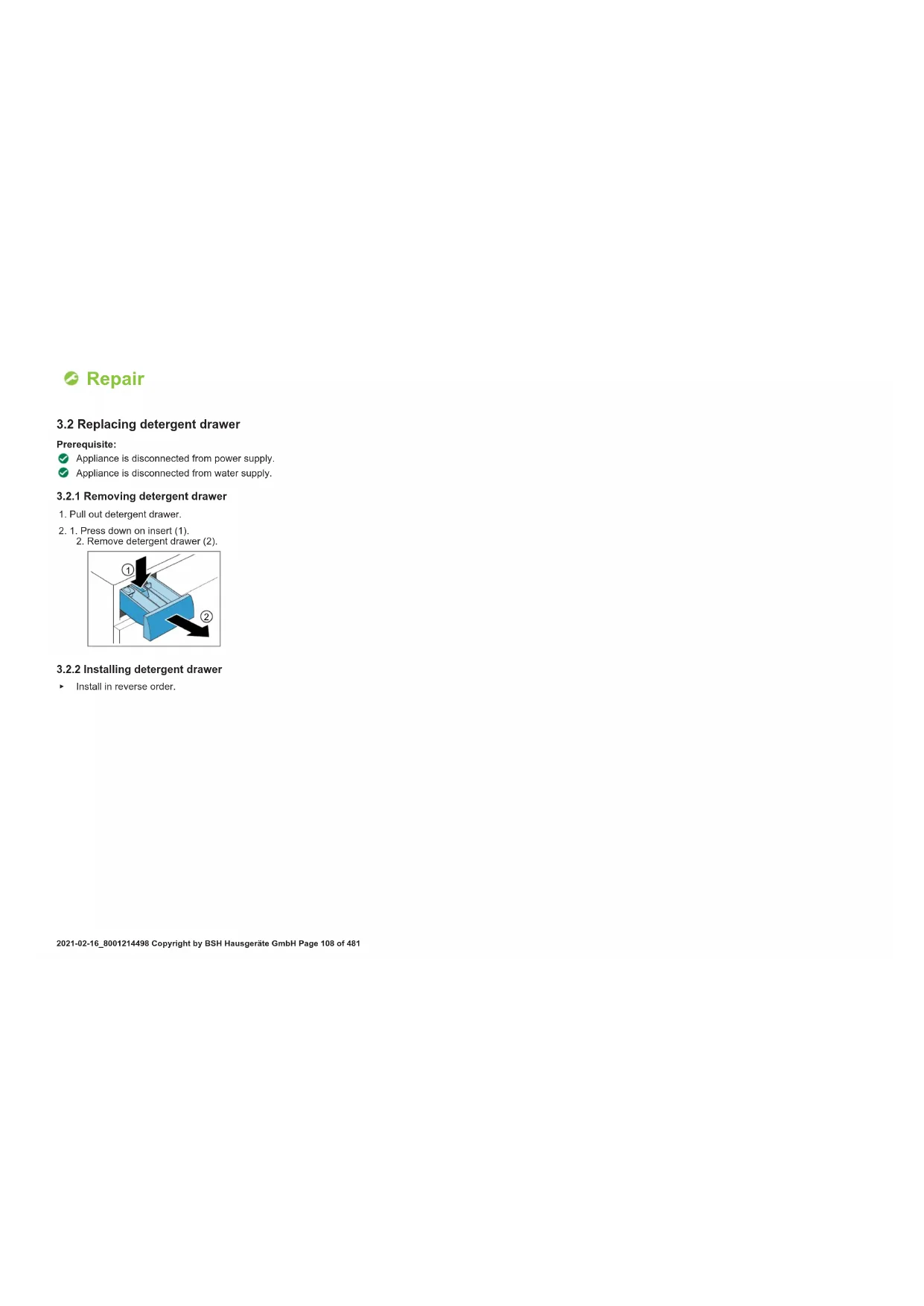 Install in reverse order. Repair 2021-02-16_8001214498 Copyright by BSH Hausgeräte GmbH Page107of4813.2 Replacing detergent drawer Prerequisite: Appliance is disconnected from power supply. Appliance is disconnected from water supply.