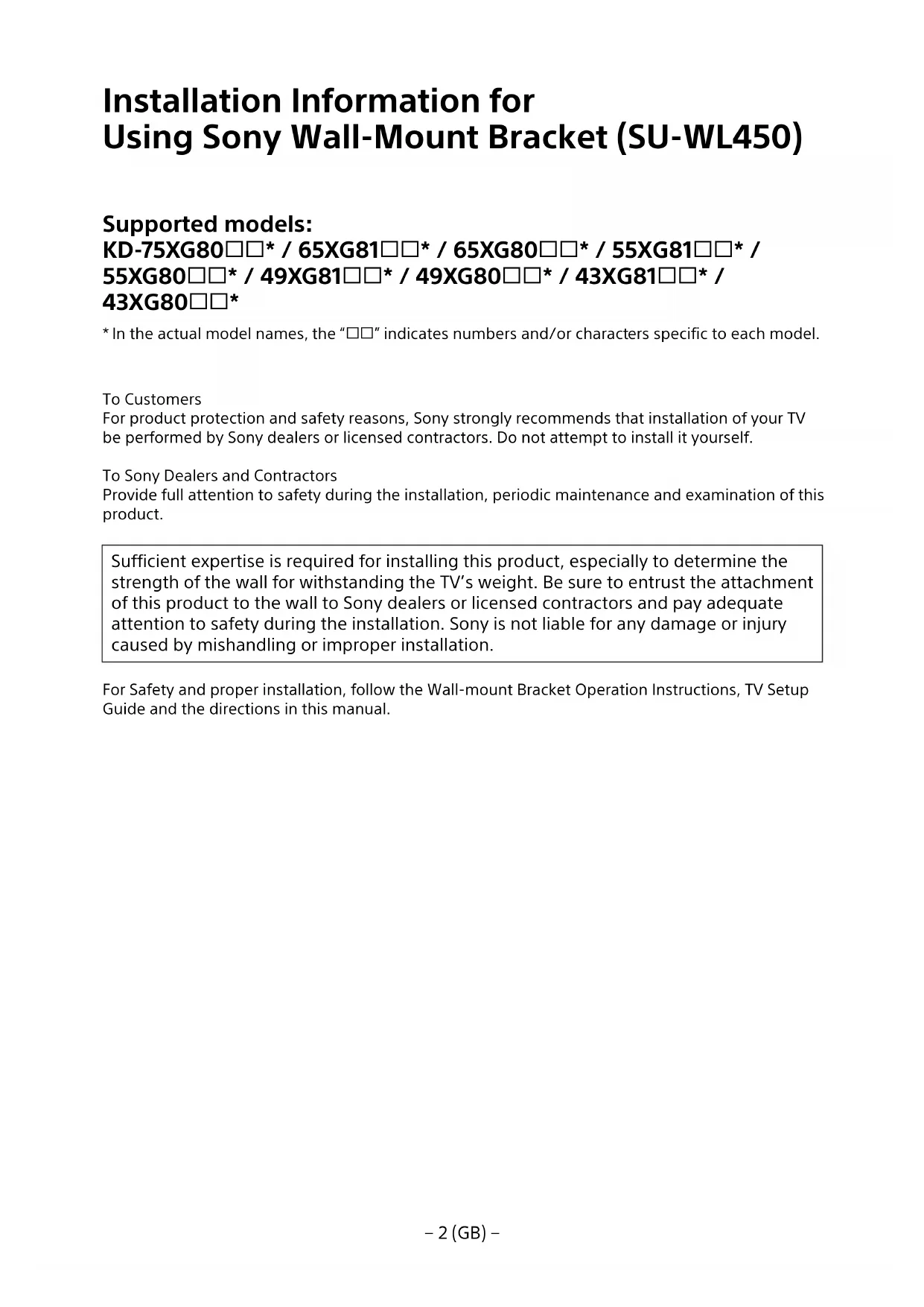 - In the actual model names, the “” indicates numbers and/or characters specific to each model. To Customers For product protection and safety reasons, Sony strongly recommends that installation of your TV be performed by Sony dealers or licensed contractors. Do not attempt to install it yourself. To Sony Dealers and Contractors Provide full attention to safety during the installation, periodic maintenance and examination of this product. Sufficient expertise is required for installing this product, especially to determine the strength of the wall for withstanding the TV’s weight. Be sure to entrust the attachment of this product to the wall to Sony dealers or licensed contractors and pay adequate attention to safety during the installation. Sony is not liable for any damage or injury caused by mishandling or improper installation. For Safety and proper installation, follow the Wall-mount Bracket Operation Instructions, TV Setup Guide and the directions in this manual.− 3 (GB) −