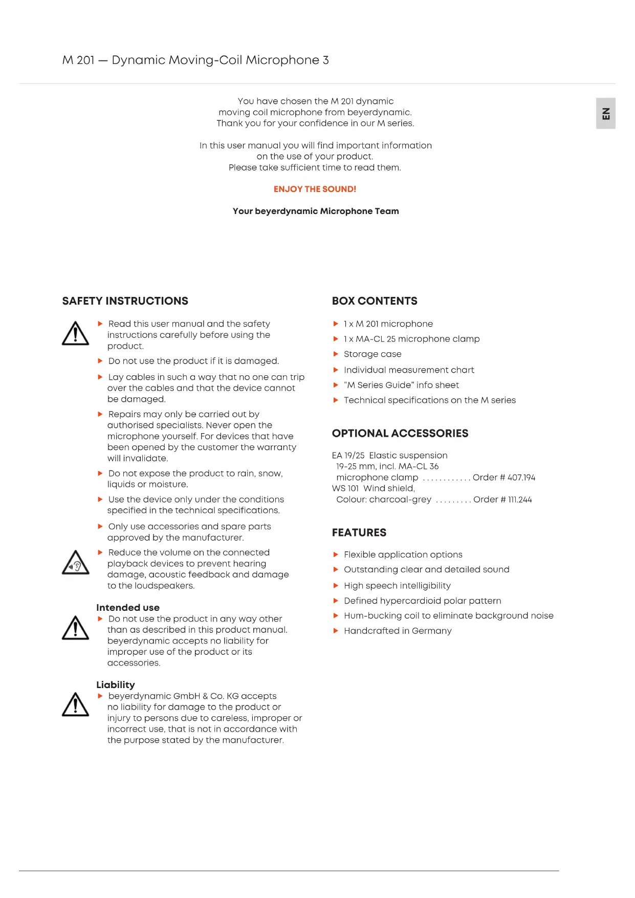 You have chosen the M 201 dynamic moving coil microphone from beyerdynamic. Thank you for your confidence in our M series. In this user manual you will find impoant information on the use of your product. Please take suicient time to read them. ENJOY THE SOUND! Your beyerdynamic Microphone Team SAFETY INSTRUCTIONS Read this user manual and the safety inructions carefully before using the product. Do not use the product if it is damaged. Lay cables in such a way that no one can trip over the cables and that the device cannot be damaged. Repairs may only be carried out by authorised specialis. Never open the microphone yourself. For devices that have been opened by the cuomer the warranty will invalidate. Do not expose the product to rain, snow, liquids or moiure. Use the device only under the conditions specified in the technical specifications. Only use accessories and spare pas approved by the manufacturer. Reduce the volume on the connected playback devices to prevent hearing damage, acouic feedback and damage to the loudspeakers. Intended use Do not use the product in any way other than as described in this product manual. beyerdynamic accepts no liability for improper use of the product or its accessories. Liability beyerdynamic GmbH & Co. KG accepts no liability for damage to the product or injury to persons due to careless, improper or incorrect use, that is not in accordance with the purpose ated by the manufacturer. BOX CONTENTS 1 χ M 201 microphone 1 χ MA-CL 25 microphone clamp Storage case Individual measurement cha “M Series Guide” info sheet Technical specifications on the M series OPTIONAL ACCESSORIES EA 19/25 Elaic suspension 19-25 mm, incl. MA-CL 36 microphone clamp ............Order # 407.194 WS 101 Wind shield, Colour: charcoal-grey .........Order # 111.244 FEATURES Flexible application options Outanding clear and detailed sound High speech intelligibility Defined hypercardioid polar pattern Hum-bucking coil to eliminate background noise Handcraed in GermanyM 201 — Dynamic Moving-Coil Microphone 4