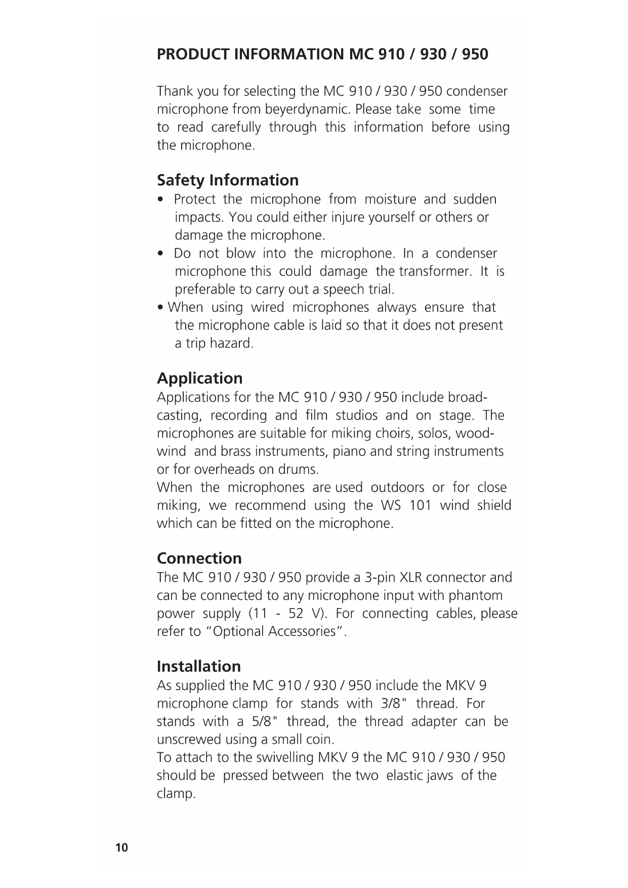Thank you for selecting the MC 910 / 930 / 950 condenser microphone from beyerdynamic. Please take some time to read carefully through this information before using the microphone. Safety Information