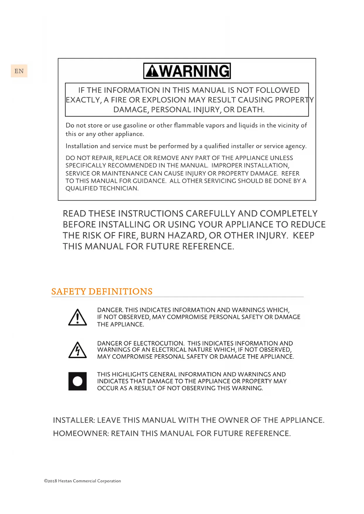 SAFETY DEFINITIONS ©2018 Hestan Commercial Corporation DANGER. THIS INDICATES INFORMATION AND WARNINGS WHICH, IF NOT OBSERVED, MAY COMPROMISE PERSONAL SAFETY OR DAMAGE THE APPLIANCE. DANGER OF ELECTROCUTION. THIS INDICATES INFORMATION AND WARNINGS OF AN ELECTRICAL NATURE WHICH, IF NOT OBSERVED, MAY COMPROMISE PERSONAL SAFETY OR DAMAGE THE APPLIANCE. THIS HIGHLIGHTS GENERAL INFORMATION AND WARNINGS AND INDICATES THAT DAMAGE TO THE APPLIANCE OR PROPERTY MAY OCCUR AS A RESULT OF NOT OBSERVING THIS WARNING.TABLE OF CONTENTS