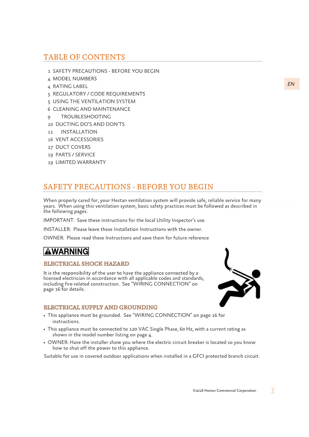 11 INSTALLATION 16 VENT ACCESSORIES 17 DUCT COVERS 19 PARTS / SERVICE 19 LIMITED WARRANTY When properly cared for, your Hestan ventilation system will provide safe, reliable service for many years. When using this ventilation system, basic safety practices must be followed as described in the following pages. IMPORTANT: Save these instructions for the local Utility Inspector’s use. INSTALLER: Please leave these Installation Instructions with the owner. OWNER: Please read these Instructions and save them for future reference ©2018 Hestan Commercial Corporation