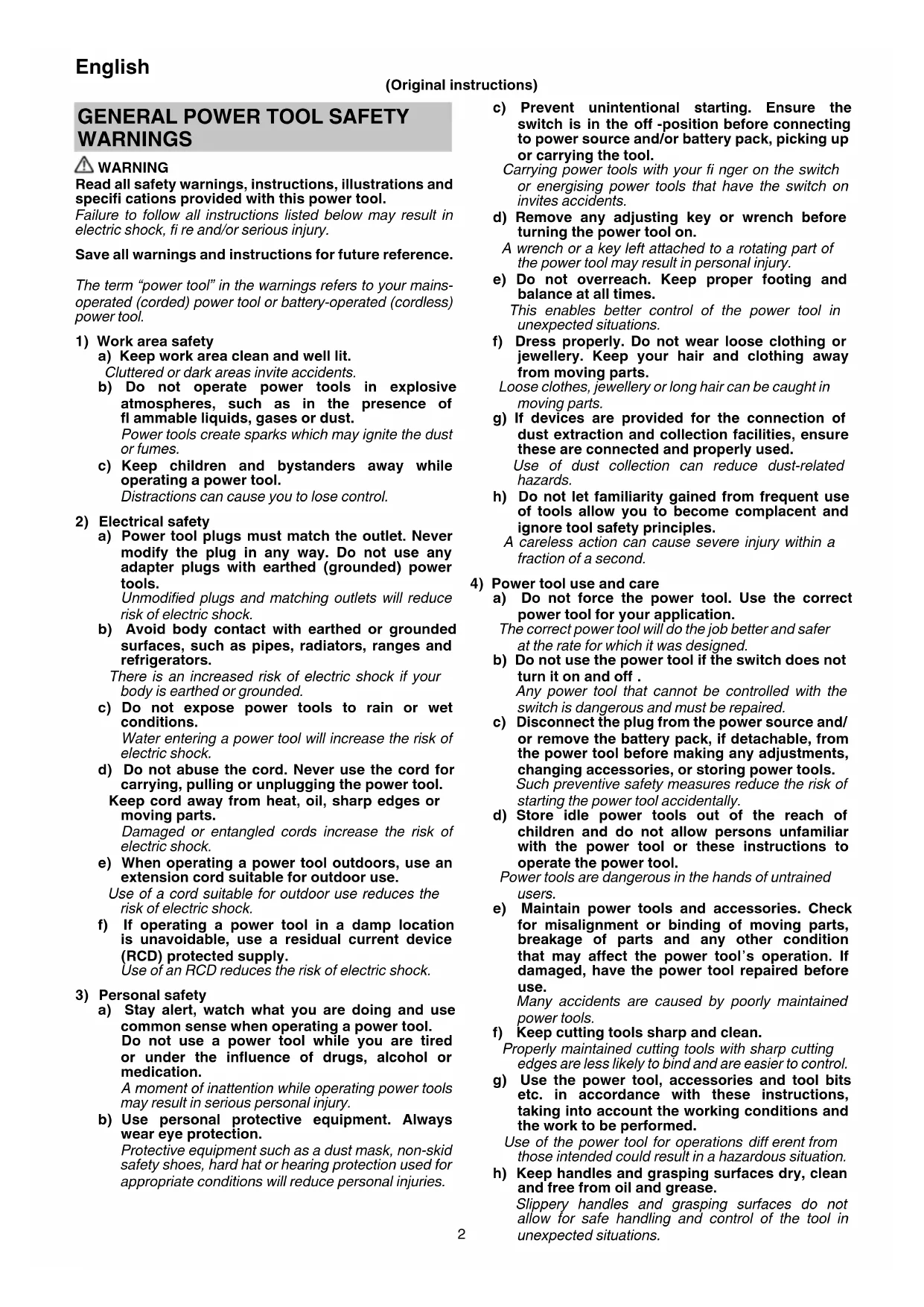 a) Do not force the power tool. Use the correct power tool for your application. The correct power tool will do the job better and safer at the rate for which it was designed. b) Do not use the power tool if the switch does not turn it on and off . Any power tool that cannot be controlled with the switch is dangerous and must be repaired. c) Disconnect the plug from the power source and/ or remove the battery pack, if detachable, from the power tool before making any adjustments, changing accessories, or storing power tools. Such preventive safety measures reduce the risk of starting the power tool accidentally. d) Store idle power tools out of the reach of children and do not allow persons unfamiliar with the power tool or these instructions to operate the power tool. Power tools are dangerous in the hands of untrained users. e) Maintain power tools and accessories. Check for misalignment or binding of moving parts, breakage of parts and any other condition that may aff ect the power toolʼs operation. If damaged, have the power tool repaired before use. Many accidents are caused by poorly maintained power tools. f) Keep cutting tools sharp and clean. Properly maintained cutting tools with sharp cutting edges are less likely to bind and are easier to control. g) Use the power tool, accessories and tool bits etc. in accordance with these instructions, taking into account the working conditions and the work to be performed. Use of the power tool for operations diff erent from those intended could result in a hazardous situation. h) Keep handles and grasping surfaces dry, clean and free from oil and grease. Slippery handles and grasping surfaces do not allow for safe handling and control of the tool in unexpected situations.