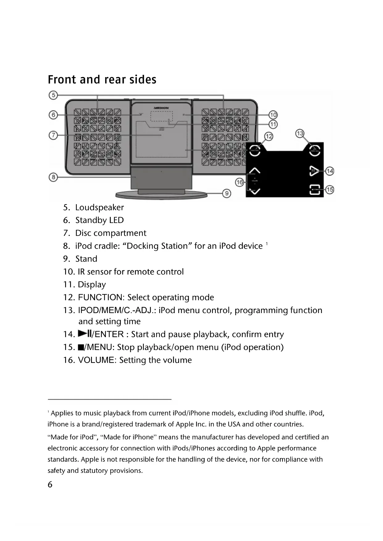 Applies to music playback from current iPod/iPhone models, excluding iPod shuffle. iPod, iPhone is a brand/registered trademark of Apple Inc. in the USA and other countries. “Made for iPod”, “Made for iPhone” means the manufacturer has developed and certified an electronic accessory for connection with iPods/iPhones according to Apple performance standards. Apple is not responsible for the handling of the device, nor for compliance with safety and statutory provisions.7