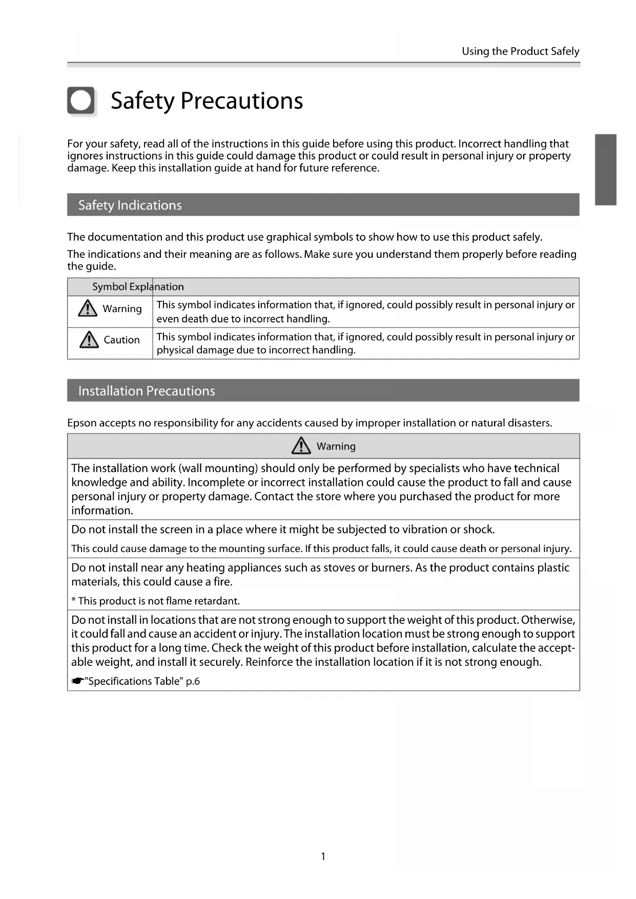 Safety Precautions For your safety, read all of the instructions in this guide before using this product. Incorrect handling that ignores instructions in this guide could damage this product or could result in personal injury or property damage. Keep this installation guide at hand for future reference. Safety Indications The documentation and this product use graphical symbols to show how to use this product safely. The indications and their meaning are as follows. Make sure you understand them properly before reading the guide. Symbol Explanation Warning This symbol indicates information that, if ignored, could possibly result in personal injury or even death due to incorrect handling. Caution This symbol indicates information that, if ignored, could possibly result in personal injury or physical damage due to incorrect handling. Installation Precautions Epson accepts no responsibility for any accidents caused by improper installation or natural disasters. Warning The installation work (wall mounting) should only be performed by specialists who have technical knowledge and ability. Incomplete or incorrect installation could cause the product to fall and cause personal injury or property damage. Contact the store where you purchased the product for more information. Do not install the screen in a place where it might be subjected to vibration or shock. This could cause damage to the mounting surface. If this product falls, it could cause death or personal injury. Do not install near any heating appliances such as stoves or burners. As the product contains plastic materials, this could cause a fire.
