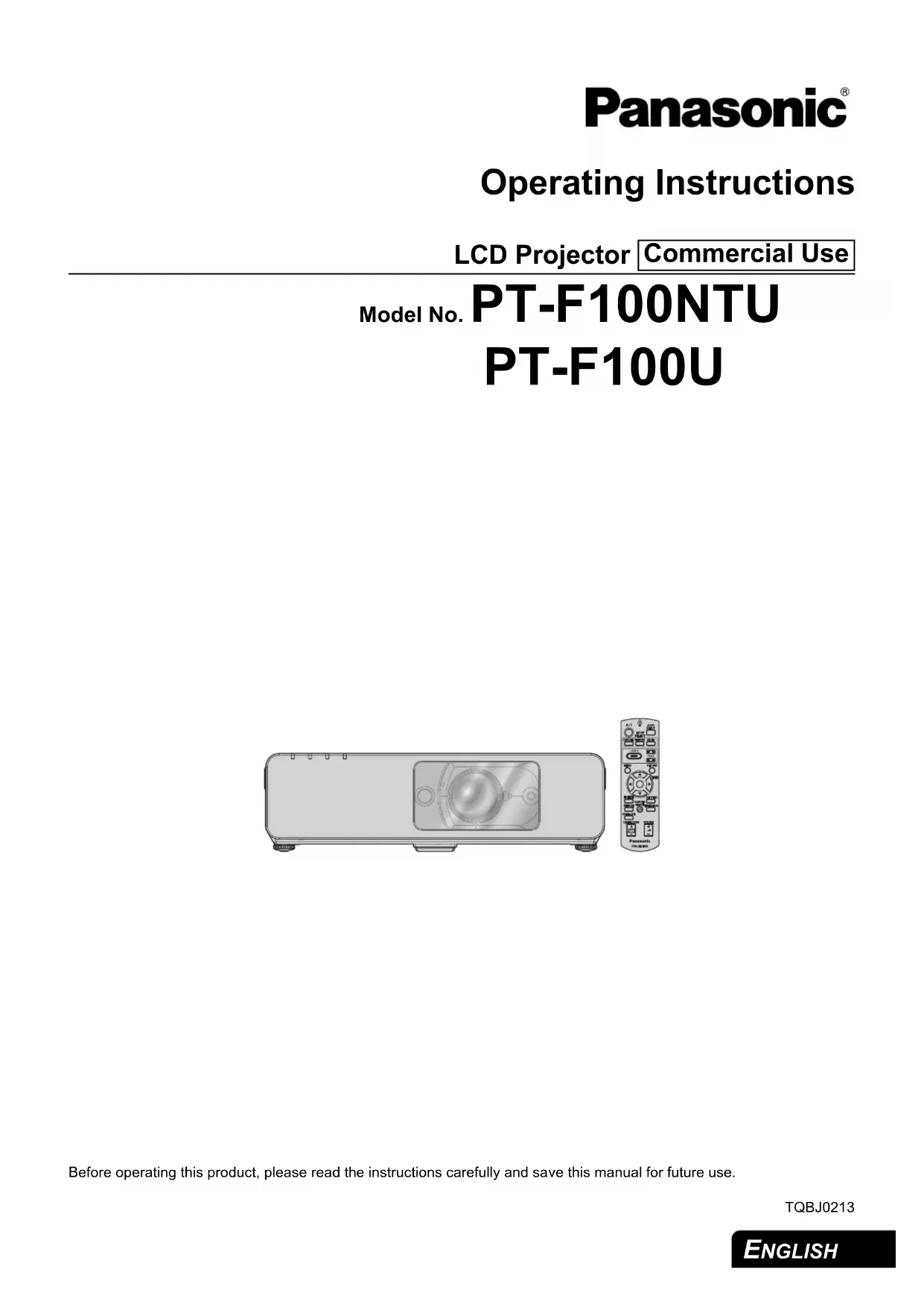 ENGLISH Operating Instructions LCD Projector Model No. PT-F100NTU PT-F100U Before operating this product, please read the instructions carefully and save this manual for future use. TQBJ0213 Commercial UseImportant Information ENGLISH - 2 Important Safety Notice Dear Panasonic Customer: This instruction booklet provides all the necessary operating information that you might require. We hope it will help you to get the most out of your new product, and that you will be pleased with your Panasonic LCD projector. The serial number of your product may be found on its bottom. You should note it in the space provided below and retain this booklet in case service is required. Model number: PT-F100NTU / PT-F100U Serial number: