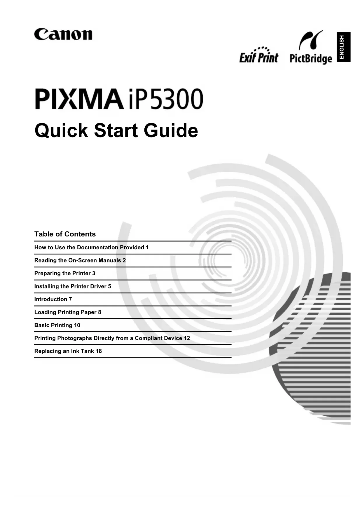 Office Equipment Program is a global program that promotes energy saving through the use of computer and other office equipment. The program backs the development and dissemination of products with functions that effectively reduce energy consumption. It is an open system in which business can participate voluntarily. The targeted products are office equipment such as computers, monitors, printers, faxes and copiers. Their standards and logos are uniform among participating nations. Power Requirements Never use a power supply voltage other than that supplied in the country of purchase. Using the incorrect voltage could cause a fire or electric shock. The correct power supply voltages and frequencies are as follows: AC 100-240V, 50/60Hz About Consumables Consumables (ink tanks / FINE Cartridges) are available for 5 years after production has stopped. Safety Precautions Model Number: K10285 (iP5300) Warning z Never attempt to plug the power cord into the power outlet or unplug the power cord when your hands are wet. z Never damage, modify, stretch, or excessively bend or twist the power cord. Do not place heavy objects on the power cord. z Never use any power supply other than the standard power supply available in the country of purchase. Using the incorrect voltage and frequency could cause a fire or electric shock.z Always push the plug all the way into the power outlet. Caution z For safety reasons, store ink tanks out of the reach of small children. z Do not drop or shake ink tanks as this may cause the ink to leak out and stain your clothes and hands. Also read the Safety Precautions in the User’s Guide on-screen manual. Observe the warnings and cautions to avoid personal injury or damage to the printer.1How to Use the Documentation Provided ENGLISH How to Use the Documentation Provided Easy Setup Instructions (Setup Sheet) Be sure to read this sheet first. This sheet includes instructions for setting up your printer and getting it ready for use. Quick Start Guide (This guide) Read this guide when starting to use the printer. After following instructions in the Easy Setup Instructions (Setup Sheet), we recommend you read this guide to familiarize yourself with the basic operations, for example, printing from your computer and a PictBridge compliant device. On-screen Manuals User’s Guide Read this guide when starting to use the printer. If the Quick Start Guide does not provide you enough information, please refer to the User’s Guide that can be installed from the Setup CD-ROM. This guide provides detailed instructions for: z printing from your computer z compatible media types z routine maintenance z troubleshooting Additional guides are also available for advanced features. Printer Driver Guide Refer to this guide for full instructions on printer driver setting. Photo Application Guide Refer to this guide for instructions on using the various application software included on the Setup CD-ROM.2 Reading the On-screen Manuals ENGLISH Reading the On-screen Manuals Along with this Quick Start Guide, on-screen manuals are also supplied with your printer. For detailed instructions on installing the on-screen manuals, refer to the Easy Setup Instructions (Setup Sheet). You can view the on-screen manuals in the following way: To view the on-screen manual, double-click the iP5300 On-screen Manual shortcut icon on the desktop, or click Start > All Programs (or Programs) > Canon iP5300 Manual > iP5300 On- screen Manual. System Requirements Browser: Windows HTML Help Viewer To view the on-screen manual, double-click the iP5300 On-screen Manual alias on the desktop. System Requirements Browser: Help Viewer Note z Microsoft Internet Explorer