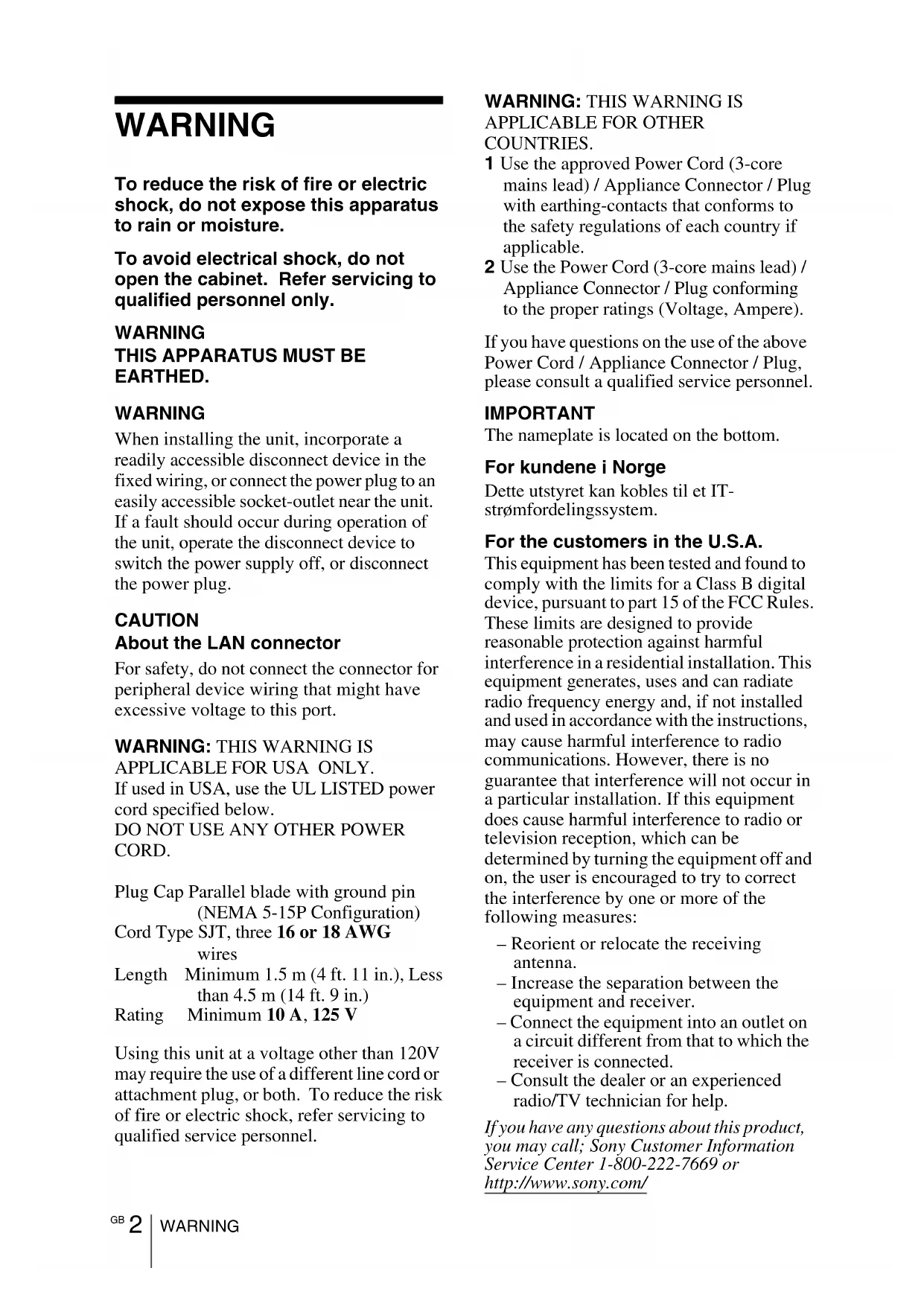 COUNTRIES. 1 Use the approved Power Cord (3-core mains lead) / Appliance Connector / Plug with earthing-contacts that conforms to the safety regulations of each country if applicable. 2 Use the Power Cord (3-core mains lead) / Appliance Connector / Plug conforming to the proper ratings (Voltage, Ampere). If you have questions on the use of the above Power Cord / Appliance Connector / Plug, please consult a qualified service personnel. IMPORTANT The nameplate is located on the bottom. For kundene i Norge Dette utstyret kan kobles til et IT- strømfordelingssystem. For the customers in the U.S.A. This equipment has been tested and found to comply with the limits for a Class B digital device, pursuant to part 15 of the FCC Rules. These limits are designed to provide reasonable protection against harmful interference in a residential installation. This equipment generates, uses and can radiate radio frequency energy and, if not installed and used in accordance with the instructions, may cause harmful interference to radio communications. However, there is no guarantee that interference will not occur in a particular installation. If this equipment does cause harmful interference to radio or television reception, which can be determined by turning the equipment off and on, the user is encouraged to try to correct the interference by one or more of the following measures: – Reorient or relocate the receiving antenna. – Increase the separation between the equipment and receiver. – Connect the equipment into an outlet on a circuit different from that to which the receiver is connected. – Consult the dealer or an experienced radio/TV technician for help. If you have any questions about this product, you may call; Sony Customer Information Service Center 1-800-222-7669 or http://www.sony.com/3