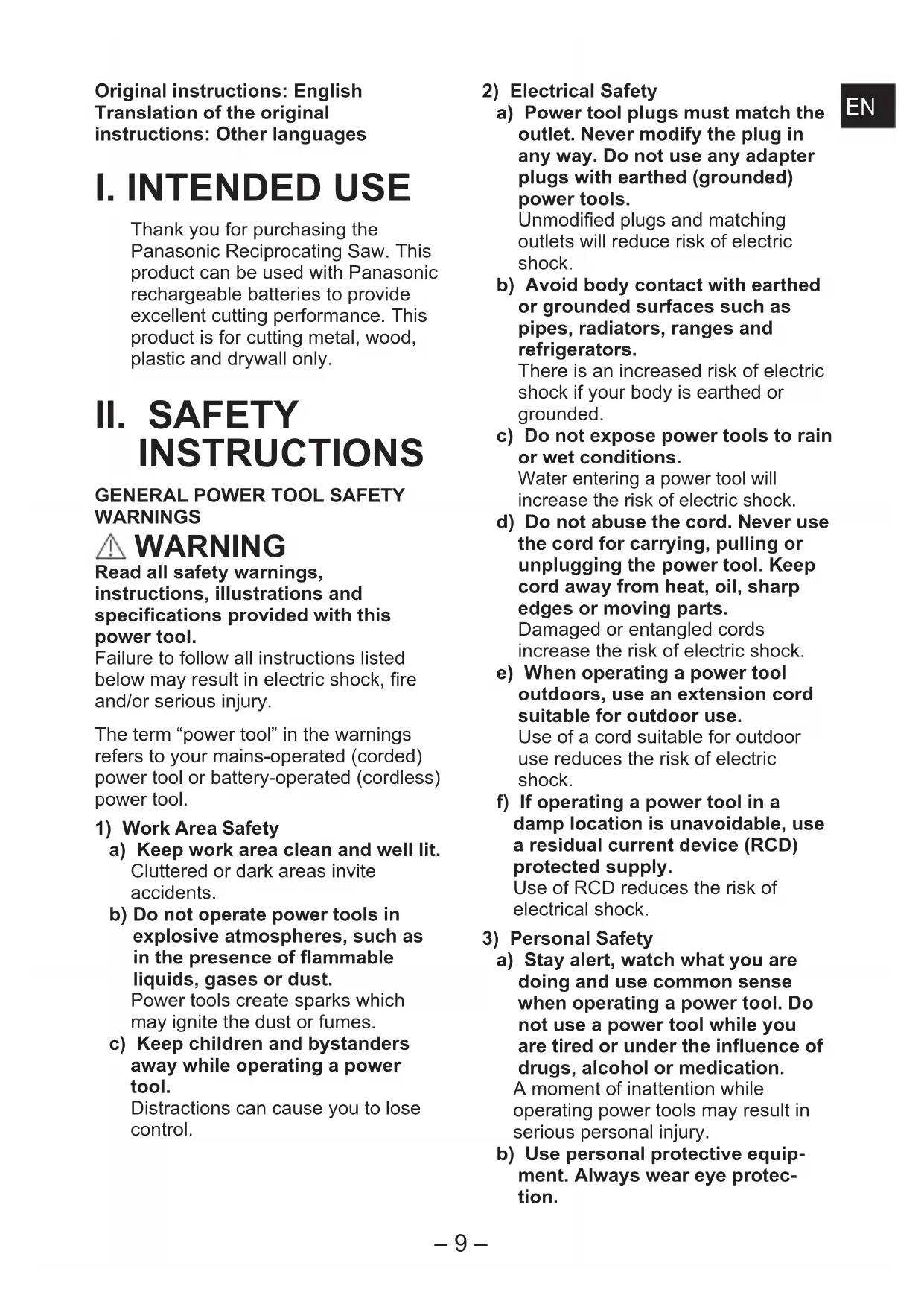 Thank you for purchasing the Panasonic Reciprocating Saw. This product can be used with Panasonic rechargeable batteries to provide excellent cutting performance. This product is for cutting metal, wood, plastic and drywall only.