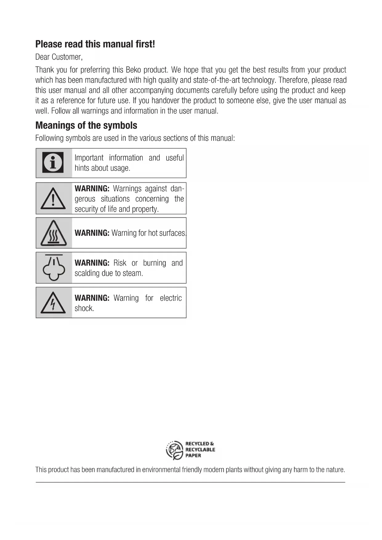 32 33Please read this manual first! Dear Customer, Thank you for preferring this Beko product. We hope that you get the best results from your product which has been manufactured with high quality and state-of-the-art technology. Therefore, please read this user manual and all other accompanying documents carefully before using the product and keep it as a reference for future use. If you handover the product to someone else, give the user manual as well. Follow all warnings and information in the user manual. Meanings of the symbols Following symbols are used in the various sections of this manual: