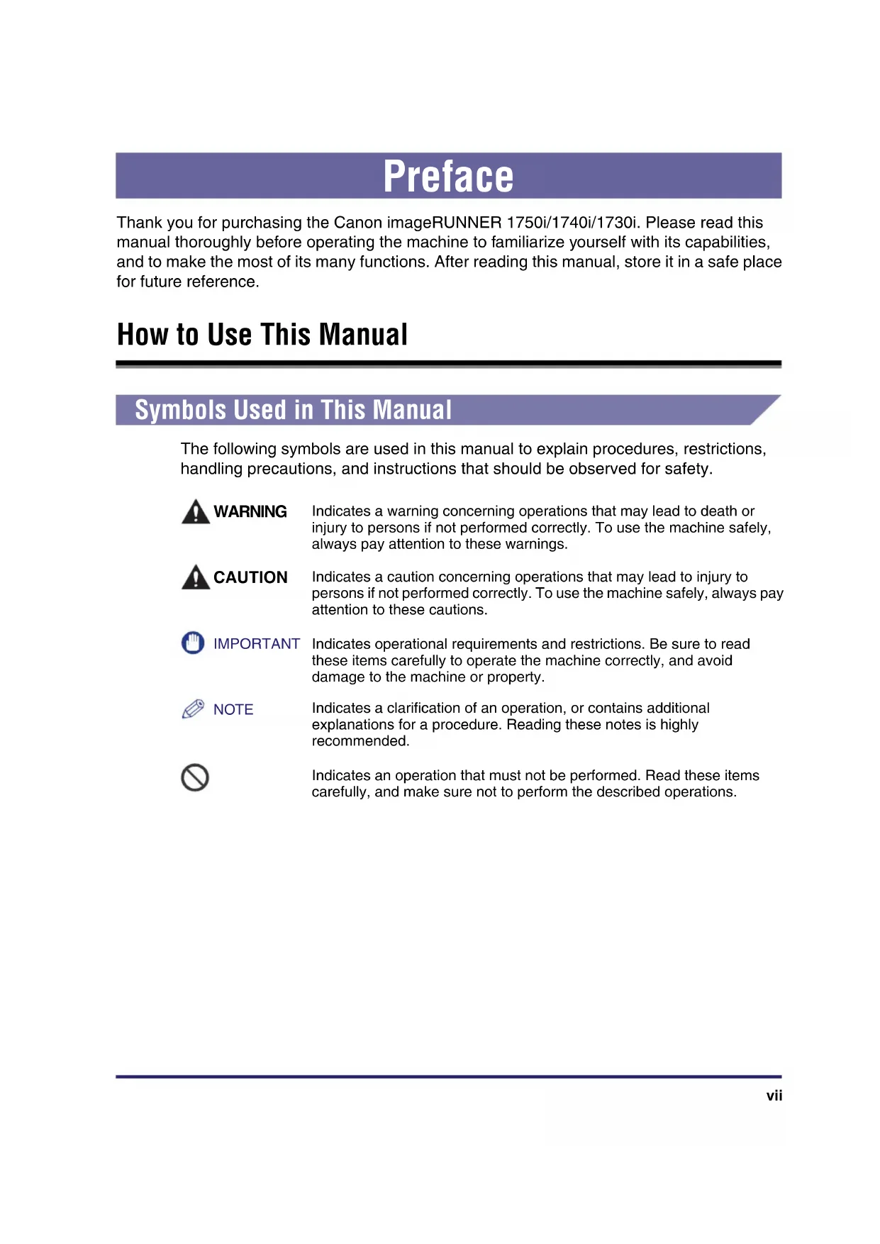 Available Paper Stock . . . . . . . . . . . . . . . . . . . . . . . . . . . . . . . . . . . . . . . . . . . . .6-2 Checking the Machine’s IP Address. . . . . . . . . . . . . . . . . . . . . . . . . . . . . . . . . .6-4 Index . . . . . . . . . . . . . . . . . . . . . . . . . . . . . . . . . . . . . . . . . . . . . . . . . . . . . . . . . . .6-5vii Preface Thank you for purchasing the Canon imageRUNNER 1750i/1740i/1730i. Please read this manual thoroughly before operating the machine to familiarize yourself with its capabilities, and to make the most of its many functions. After reading this manual, store it in a safe place for future reference. How to Use This Manual Symbols Used in This Manual The following symbols are used in this manual to explain procedures, restrictions, handling precautions, and instructions that should be observed for safety. WARNING Indicates a warning concerning operations that may lead to death or injury to persons if not performed correctly. To use the machine safely, always pay attention to these warnings. CAUTION Indicates a caution concerning operations that may lead to injury to persons if not performed correctly. To use the machine safely, always pay attention to these cautions. IMPORTANT Indicates operational requirements and restrictions. Be sure to read these items carefully to operate the machine correctly, and avoid damage to the machine or property. NOTE Indicates a clarification of an operation, or contains additional explanations for a procedure. Reading these notes is highly recommended. Indicates an operation that must not be performed. Read these items carefully, and make sure not to perform the described operations.viii Keys and Buttons Used in This Manual The following tables provide a few examples of how keys to be pressed are expressed in this manual: