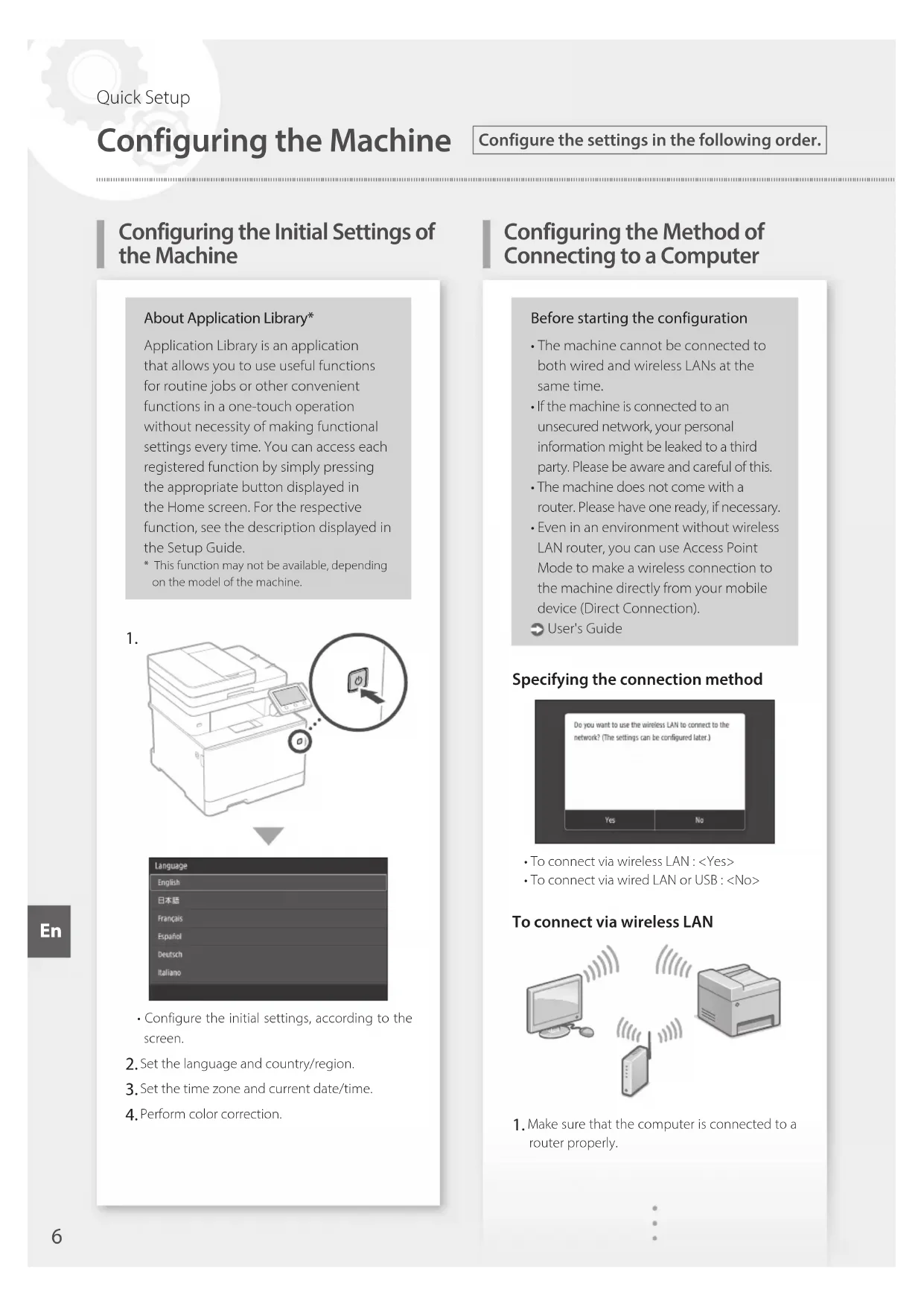 - Configure the initial settings, according to the screen. Set the language and country/region. Set the time zone and current date/time. Perform color correction.Before starting the configuration• The machine cannot be connected to both wired and wireless LANs at the same time.• If the machine is connected to an unsecured network, your personal information might be leaked to a third party. Please be aware and careful of this.• The machine does not come with a router. Please have one ready, if necessary.• Even in an environment without wireless LAN router, you can use Access Point Mode to make a wireless connection to the machine directly from your mobile device (Direct Connection). User's GuideSpecifying the connection method• To connect via wireless LAN : <Yes>• To connect via wired LAN or USB : <No>To connect via wireless LAN Make sure that the computer is connected to a router properly.