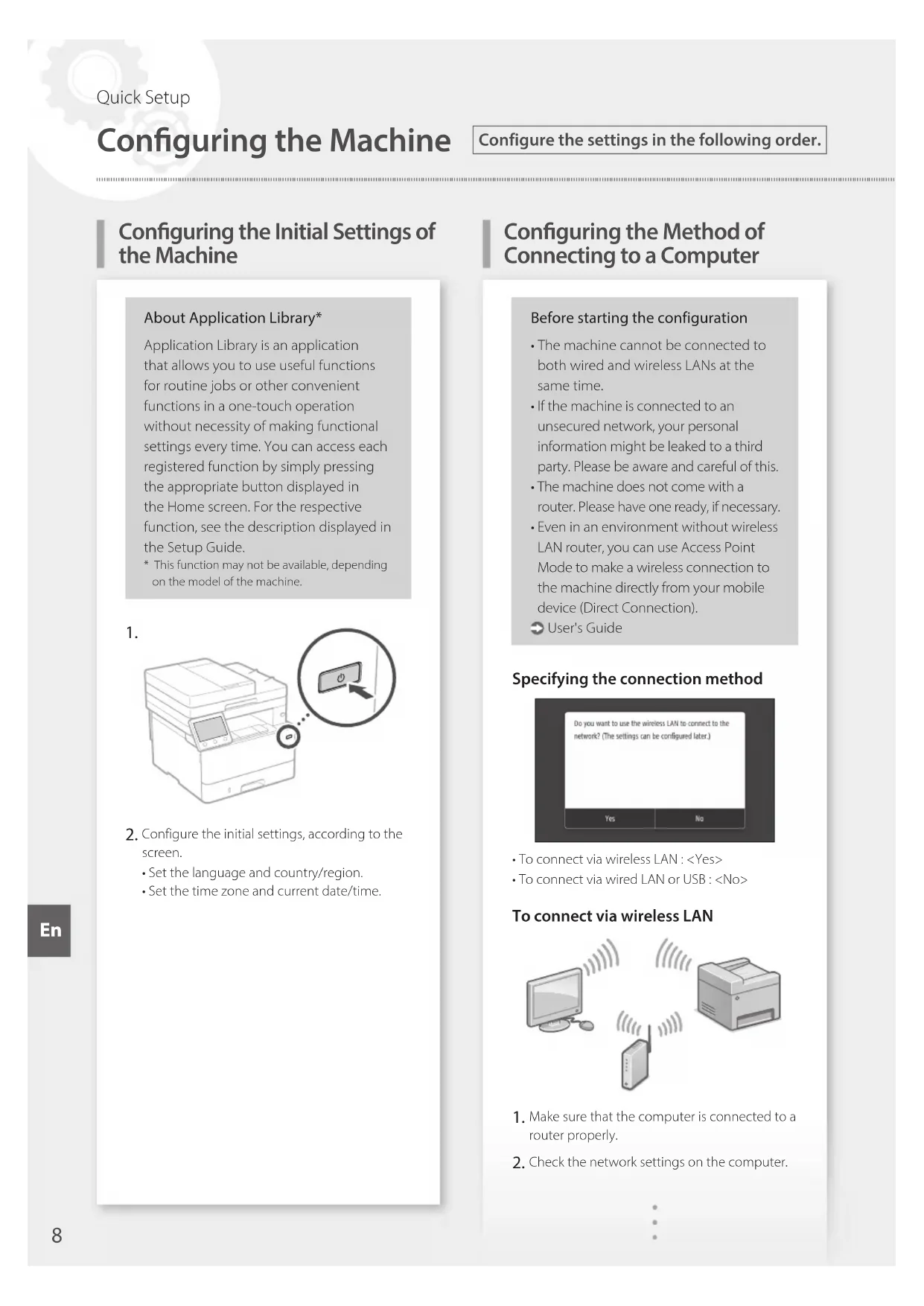 Configure the initial settings, according to the screen.• Set the language and country/region.• Set the time zone and current date/time.Before starting the configuration• The machine cannot be connected to both wired and wireless LANs at the same time.• If the machine is connected to an unsecured network, your personal information might be leaked to a third party. Please be aware and careful of this.• The machine does not come with a router. Please have one ready, if necessary.• Even in an environment without wireless LAN router, you can use Access Point Mode to make a wireless connection to the machine directly from your mobile device (Direct Connection). User's GuideSpecifying the connection method• To connect via wireless LAN : <Yes>• To connect via wired LAN or USB : <No>To connect via wireless LAN Make sure that the computer is connected to a router properly. Check the network settings on the computer.
