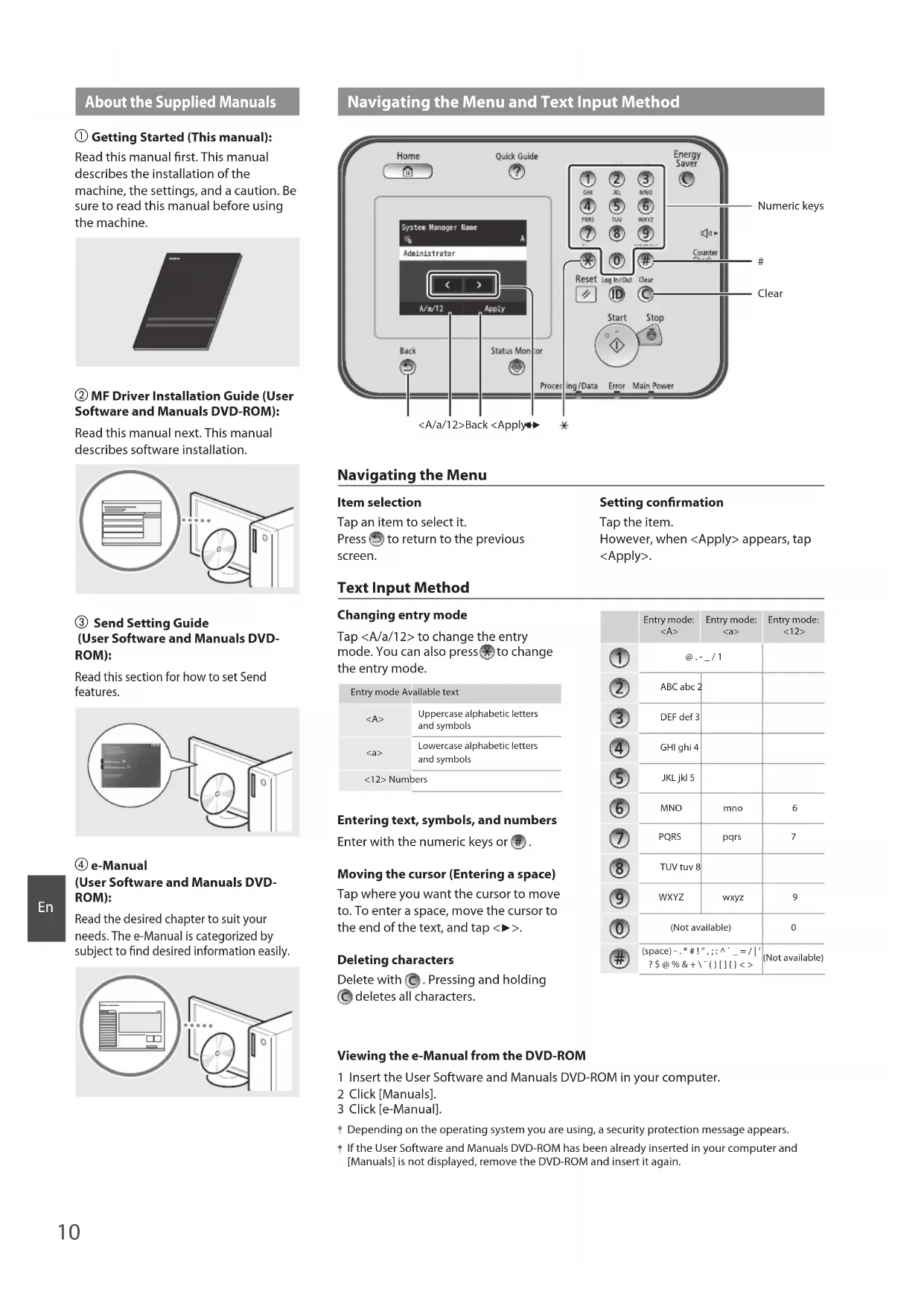 Moving the cursor (Entering a space) Tap where you want the cursor to move to. To enter a space, move the cursor to the end of the text, and tap <▶>. Deleting characters Delete with . Pressing and holding deletes all characters. Entry mode: <A>Entry mode: <a>Entry mode: <12>@ . - _ / 1ABC abc 2DEF def 3GHI ghi 4JKL jkl 5MNO mno 6PQRS pqrs 7TUV tuv 8WXYZ wxyz 9(Not available) 0(space) - . * # ! “ , ; : ^ ` _ = / | ‘ ? $ @ % & + \ ˜ ( ) [ ] { } < > (Not available) Viewing the e-Manual from the DVD-ROM 1 Insert the User Software and Manuals DVD-ROM in your computer. 2 Click [Manuals]. 3 Click [e-Manual]. Depending on the operating system you are using, a security protection message appears. If the User Software and Manuals DVD-ROM has been already inserted in your computer and [Manuals] is not displayed, remove the DVD-ROM and insert it again.11