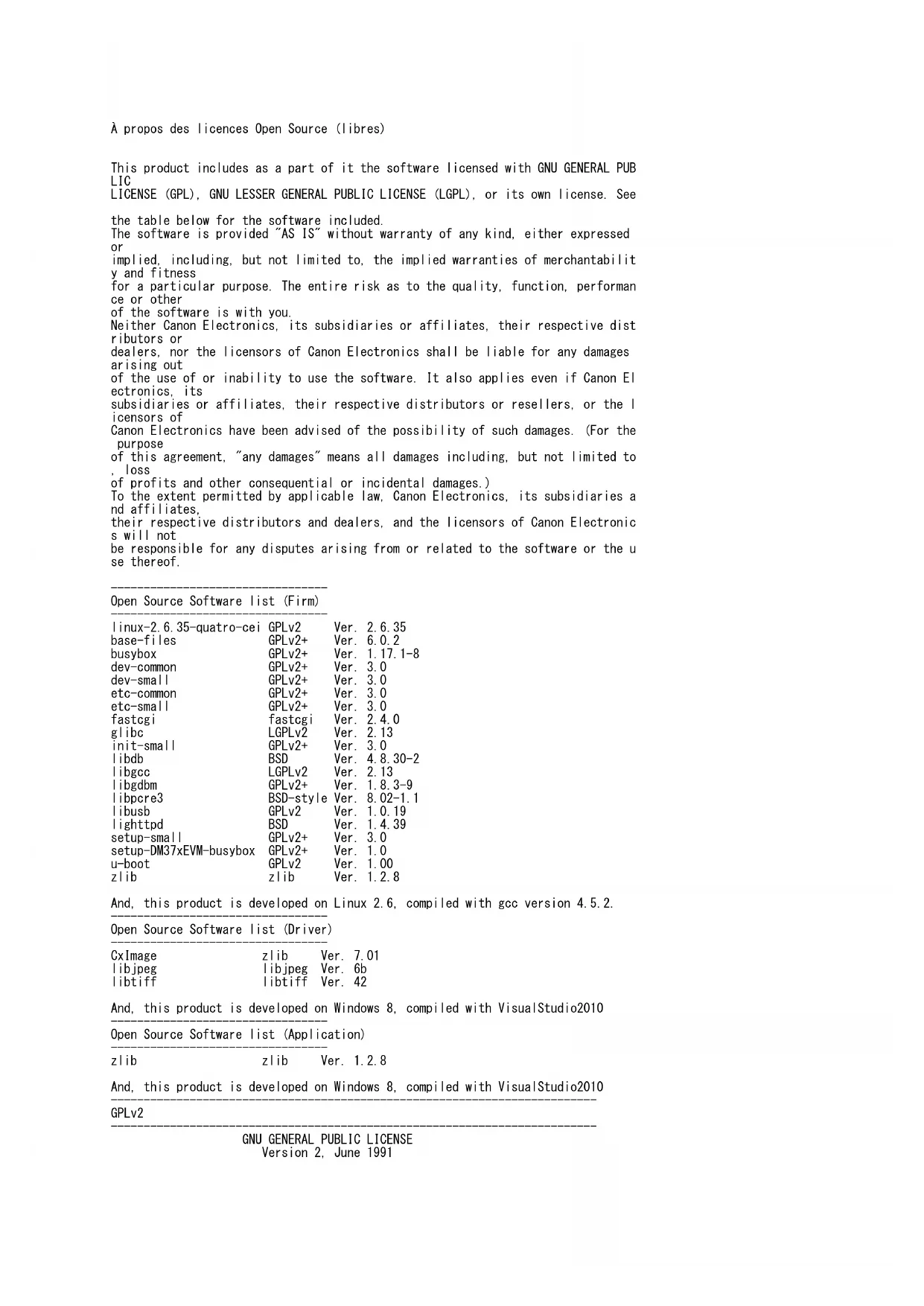 7TH FLOOR, TOWER B DLF CYBER TERRACES DLF PHASE III GURGAON - 122002 HARYANA, INDIA CANON EURASİA GÖRÜNTÜLEME VE OFİS SİSTEMLERİ ANONİM ŞİRKETİ KOZYATAĞI,DEĞİRMEN SOK.NİDA KULE İŞ MERKEZİ NO.18 KADIKÖY PUB. 6T3-0039-F1.30 © CANON ELECTRONICS INC. 2018À propos des licences Open Source (libres) This product includes as a part of it the software licensed with GNU GENERAL PUB LIC LICENSE (GPL), GNU LESSER GENERAL PUBLIC LICENSE (LGPL), or its own license. See the table below for the software included. The software is provided "AS IS" without warranty of any kind, either expressed