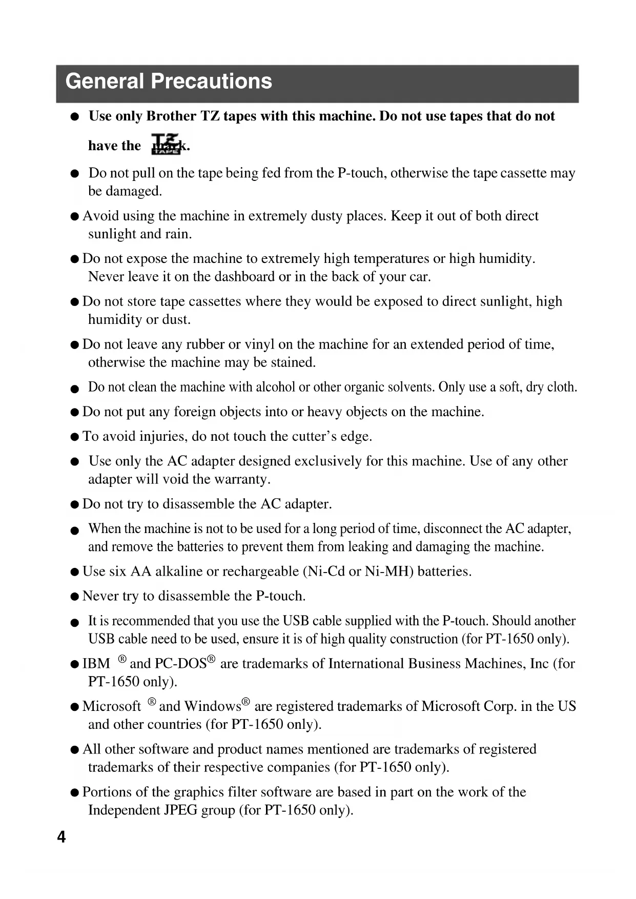 PT-16504 General Precautions ● Use only Brother TZ tapes with this machine. Do not use tapes that do not have the mark. ● Do not pull on the tape being fed from the P-touch, otherwise the tape cassette may be damaged. ● Avoid using the machine in extremely dusty places. Keep it out of both direct sunlight and rain. ● Do not expose the machine to extremely high temperatures or high humidity. Never leave it on the dashboard or in the back of your car. ● Do not store tape cassettes where they would be exposed to direct sunlight, high humidity or dust. ● Do not leave any rubber or vinyl on the machine for an extended period of time, otherwise the machine may be stained.