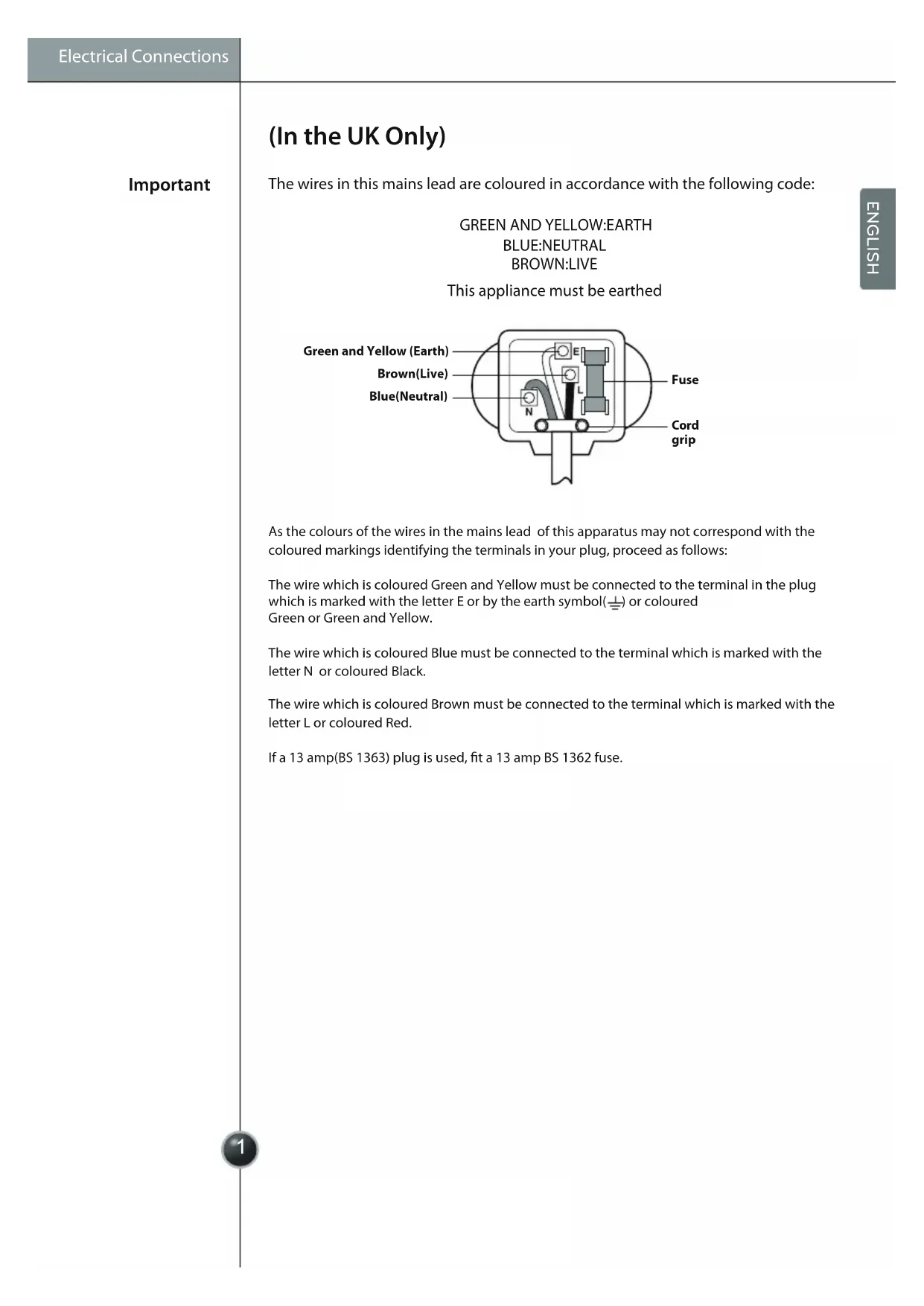 www.lg.com ENGLISH ENGLISH FRANÇAIS ESPAÑA Important The wires in this mains lead are coloured in accordance with the following code: (In the UK Only) GREEN AND YELLOW:EARTHBLUE:NEUTRALBROWN:LIVEThis appliance must be earthedGreen and Yellow (Earth) Fuse Brown(Live)Blue(Neutral)Cord grip As the colours of the wires in the mains lead of this apparatus may not correspond with the coloured markings identifying the terminals in your plug, proceed as follows:The wire which is coloured Green and Yellow must be connected to the terminal in the plug which is marked with the letter E or by the earth symbol( ) or coloured Green or Green and Yellow.The wire which is coloured Blue must be connected to the terminal which is marked with the letter N or coloured Black.The wire which is coloured Brown must be connected to the terminal which is marked with the letter L or coloured Red.If a 13 amp(BS 1363) plug is used, t a 13 amp BS 1362 fuse. Electrical Connections ENGLISH ENGLISH2