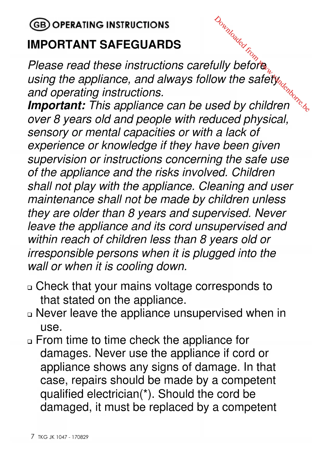Fax +32 2 359 95 50 IMPORTANT SAFEGUARDS Please read these instructions carefully before using the appliance, and always follow the safety and operating instructions. Important: This appliance can be used by children over 8 years old and people with reduced physical, sensory or mental capacities or with a lack of experience or knowledge if they have been given supervision or instructions concerning the safe use of the appliance and the risks involved. Children shall not play with the appliance. Cleaning and user maintenance shall not be made by children unless they are older than 8 years and supervised. Never leave the appliance and its cord unsupervised and within reach of children less than 8 years old or irresponsible persons when it is plugged into the wall or when it is cooling down. Check that your mains voltage corresponds to that stated on the appliance. Never leave the appliance unsupervised when in use. From time to time check the appliance for damages. Never use the appliance if cord or appliance shows any signs of damage. In that case, repairs should be made by a competent qualified electrician(*). Should the cord be damaged, it must be replaced by a competent Downloaded from www.vandenborre.be Copies of the I/B. Please reproduce them without any changes except under special instruction from Team International BELGIUM. The pages must be reproduced and folded in order to obtain a booklet A5 (+/- 148.5 mm width x 210 mm height). When folding, make sure you keep the good numbering when you turn the pages of the I/B. Don’t change the page numbering. Keep the language integrity.
