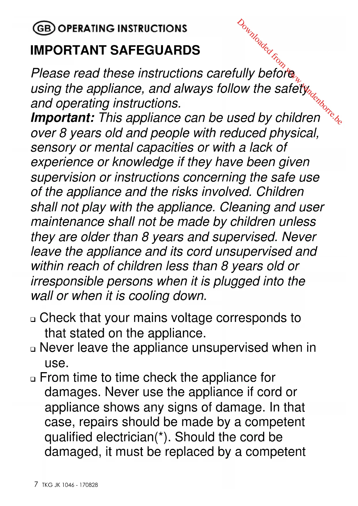 Fax +32 2 359 95 50 IMPORTANT SAFEGUARDS Please read these instructions carefully before using the appliance, and always follow the safety and operating instructions. Important: This appliance can be used by children over 8 years old and people with reduced physical, sensory or mental capacities or with a lack of experience or knowledge if they have been given supervision or instructions concerning the safe use of the appliance and the risks involved. Children shall not play with the appliance. Cleaning and user maintenance shall not be made by children unless they are older than 8 years and supervised. Never leave the appliance and its cord unsupervised and within reach of children less than 8 years old or irresponsible persons when it is plugged into the wall or when it is cooling down. Check that your mains voltage corresponds to that stated on the appliance. Never leave the appliance unsupervised when in use. From time to time check the appliance for damages. Never use the appliance if cord or appliance shows any signs of damage. In that case, repairs should be made by a competent qualified electrician(*). Should the cord be damaged, it must be replaced by a competent Downloaded from www.vandenborre.be Copies of the I/B. Please reproduce them without any changes except under special instruction from Team International BELGIUM. The pages must be reproduced and folded in order to obtain a booklet A5 (+/- 148.5 mm width x 210 mm height). When folding, make sure you keep the good numbering when you turn the pages of the I/B. Don’t change the page numbering. Keep the language integrity.