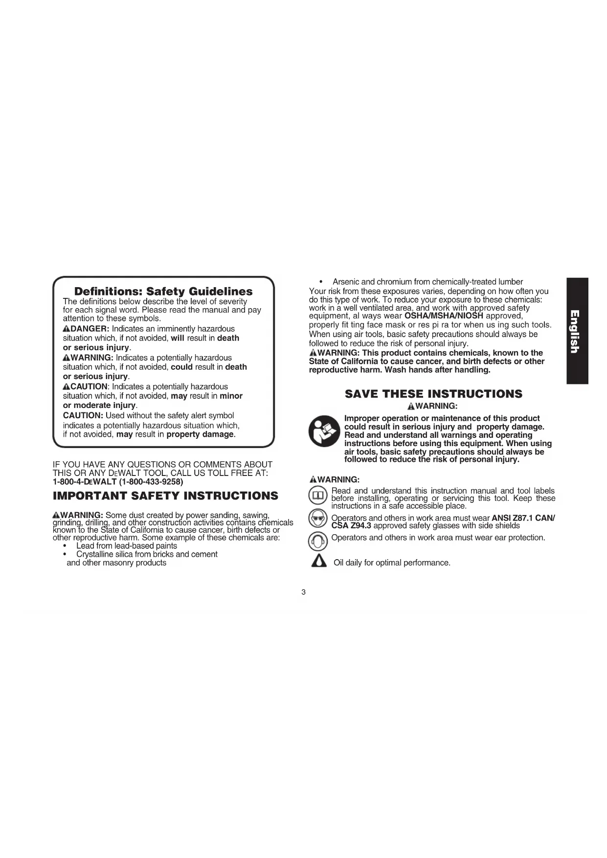 Read and understand this instruction manual and tool labels before installing, operating or servicing this tool. Keep these instructions in a safe accessible place. Operators and others in work area must wear ANSI Z87.1 CAN/ CSA Z94.3 approved safety glasses with side shields Operators and others in work area must wear ear protection. Oil daily for optimal performance.