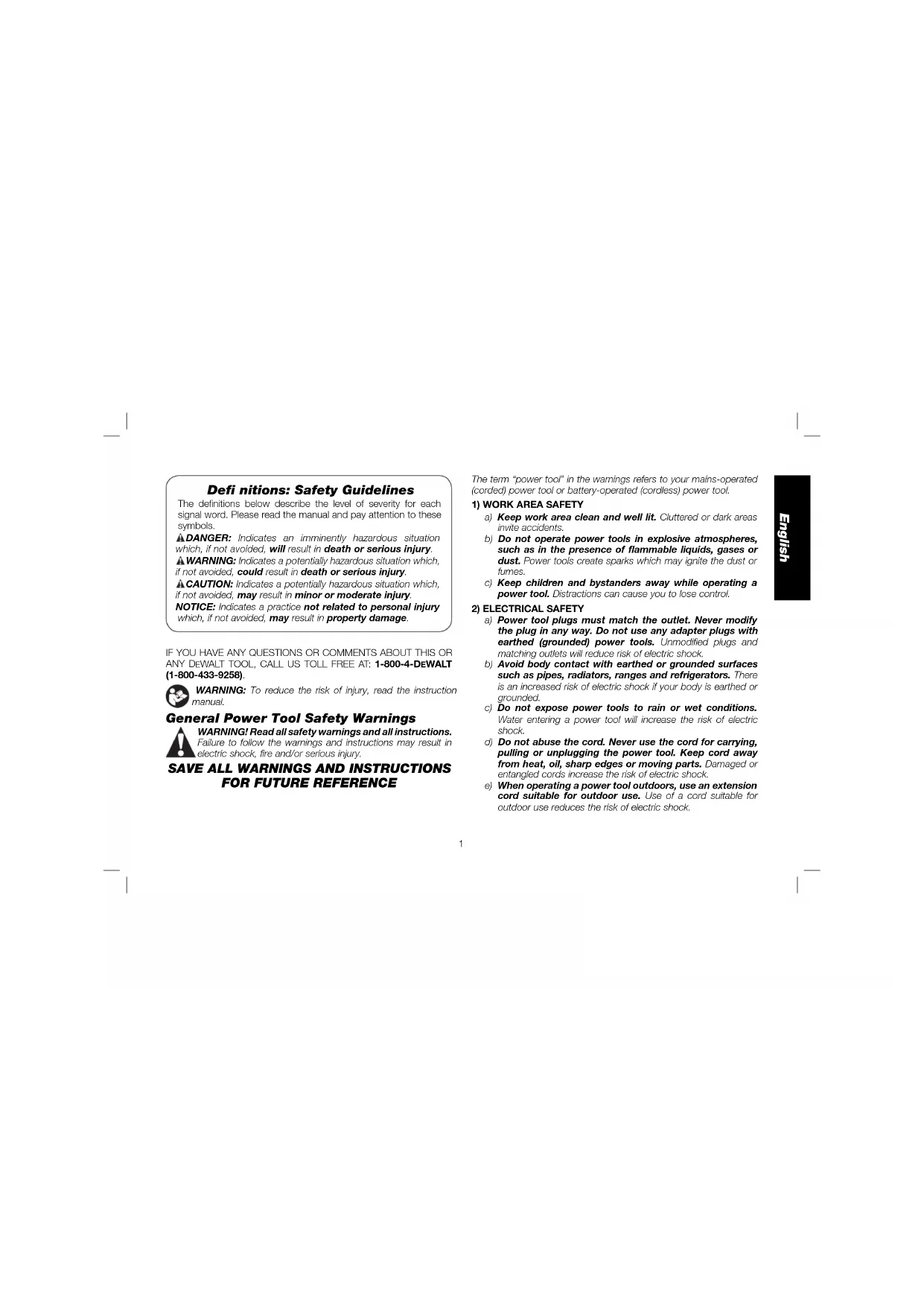 if not avoided, could result in death or serious injury. CAUTION: Indicates a potentially hazardous situation which, if not avoided, may result in minor or moderate injury. NOTICE: Indicates a practice not related to personal injury which, if not avoided, may result in property damage. IF YOU HAVE ANY QUESTIONS OR COMMENTS ABOUT THIS OR ANY D EWALT TOOL, CALL US TOLL FREE AT: 1-800-4-DEWALT (1-800-433-9258).