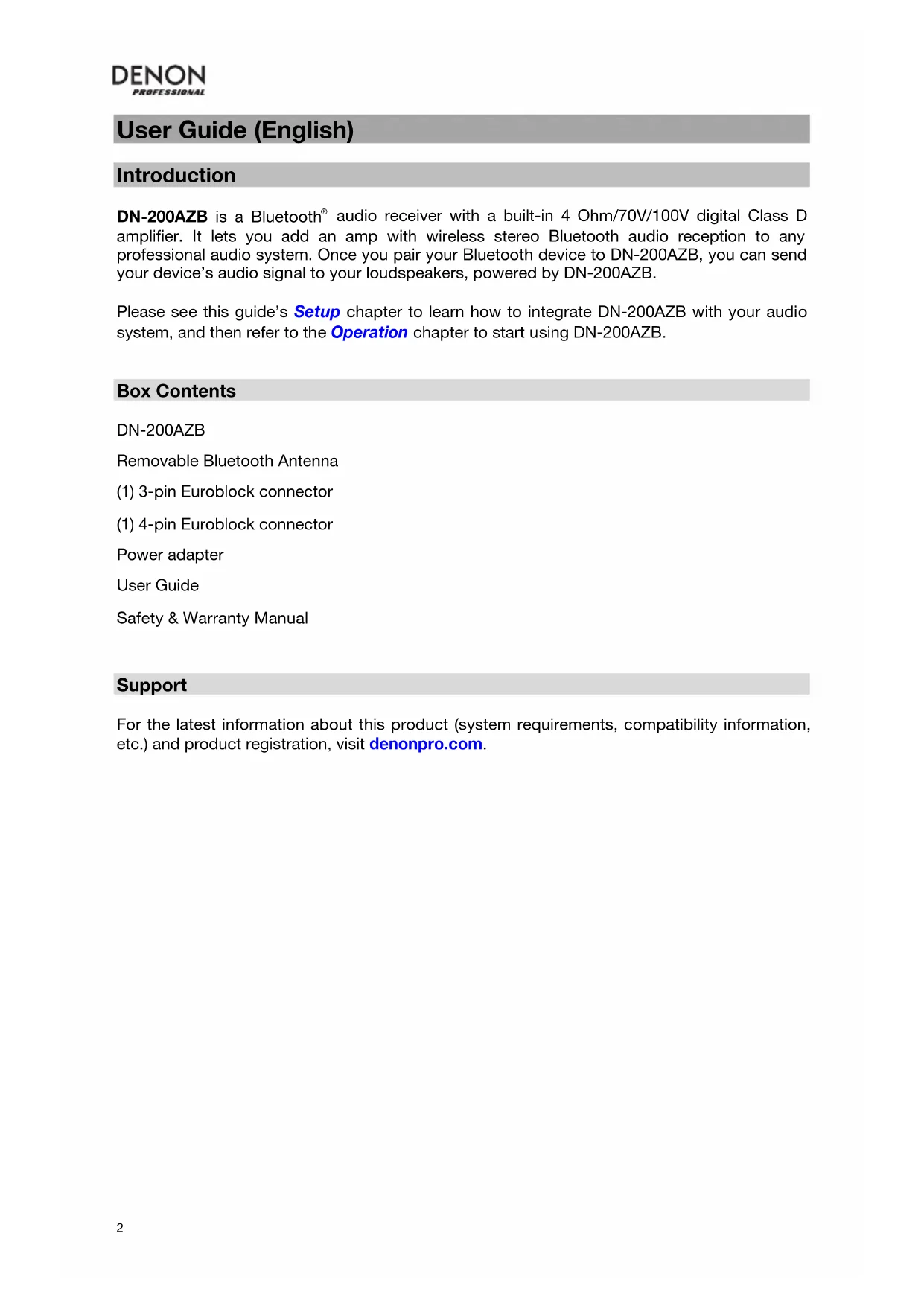 audio receiver with a built-in 4 Ohm/70V/100V digital Class D amplifier. It lets you add an amp with wireless stereo Bluetooth audio reception to any professional audio system. Once you pair your Bluetooth device to DN-200AZB, you can send your device’s audio signal to your loudspeakers, powered by DN-200AZB. Please see this guide’s Setup chapter to learn how to integrate DN-200AZB with your audio system, and then refer to the Operation chapter to start using DN-200AZB.