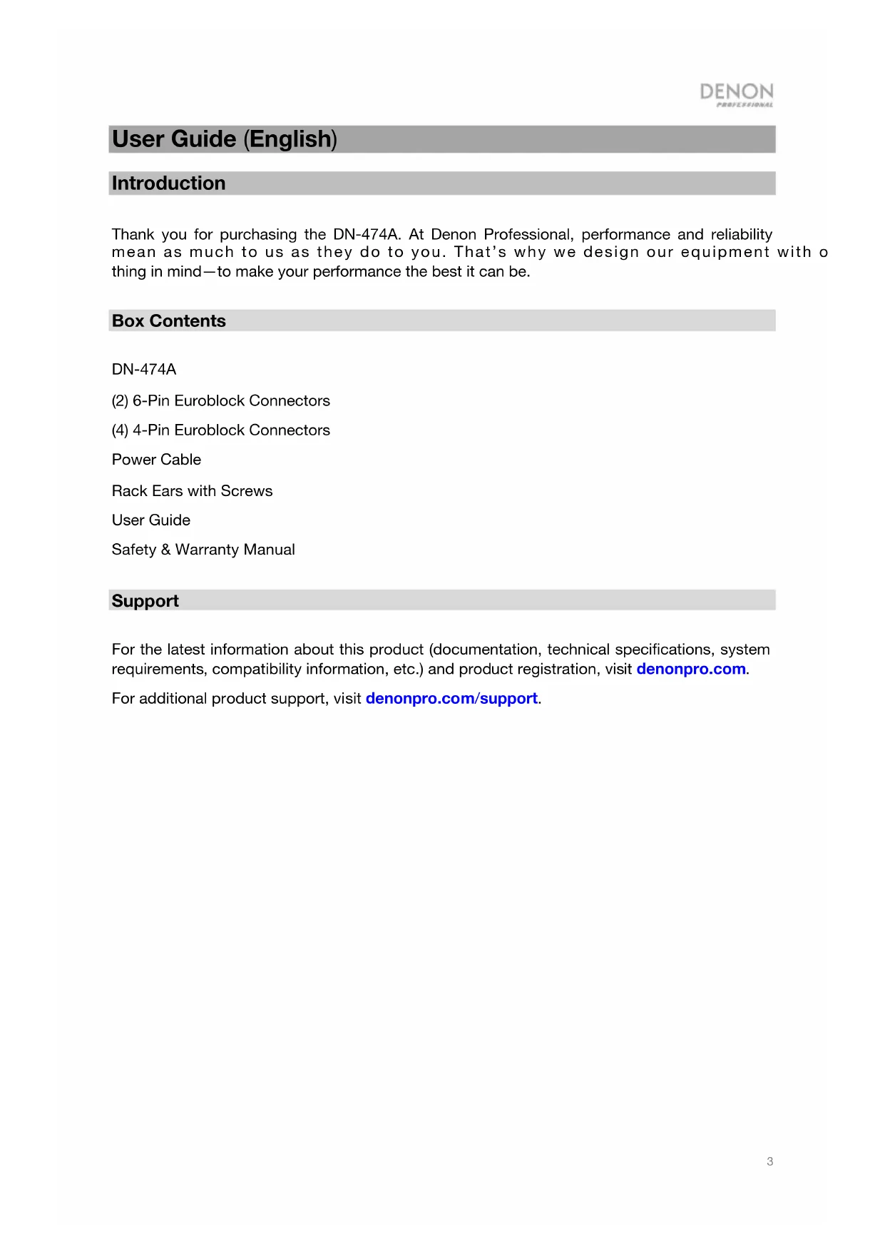 User Guide English (3–6) Guía del usuario Español (7–10) Guide d’utilisation Français (11–14) Guida per l’uso Italiano (15–18) Benutzerhandbuch Deutsch (19–22) Appendix English (23)23 User Guide (English) Introduction Thank you for purchasing the DN-474A. At Denon Professional, performance and reliability mean as much to us as they do to you. That’s why we design our equipment with only one thing in mind—to make your performance the best it can be. Box Contents DN-474A (2) 6-Pin Euroblock Connectors (4) 4-Pin Euroblock Connectors Power Cable Rack Ears with Screws User Guide Safety & Warranty Manual Support For the latest information about this product (documentation, technical specifications, system requirements, compatibility information, etc.) and product registration, visit denonpro.com. For additional product support, visit denonpro.com/support.4 Features Front Panel