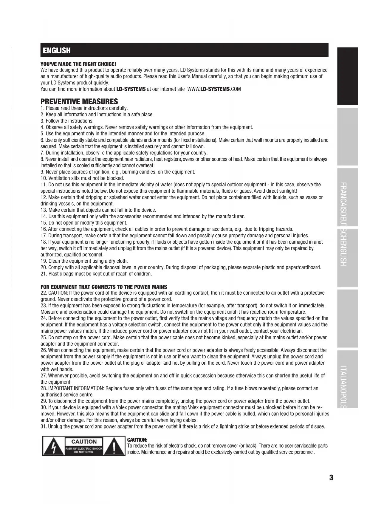 ENGLISH YOU‘VE MADE THE RIGHT CHOICE! We have designed this product to operate reliably over many years. LD Systems stands for this with its name and many years of experience as a manufacturer of high-quality audio products. Please read this User‘s Manual carefully, so that you can begin making optimum use of your LD Systems product quickly. You can find more information about LD-SYSTEMS at our Internet site WWW.LD-SYSTEMS.COM PREVENTIVE MEASURES