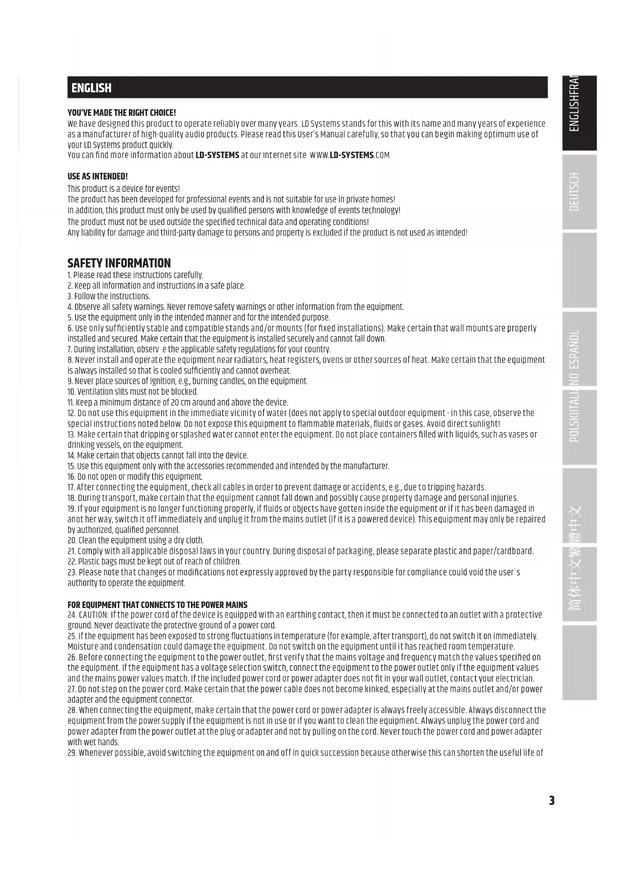 ENGLISH YOU‘VE MADE THE RIGHT CHOICE! We have designed this product to operate reliably over many years. LD Systems stands for this with its name and many years of experience as a manufacturer of high-quality audio products. Please read this User‘s Manual carefully, so that you can begin making optimum use of your LD Systems product quickly. You can nd more information about LD-SYSTEMS at our Internet site WWW.LD-SYSTEMS.COM USE AS INTENDED! This product is a device for events! The product has been developed for professional events and is not suitable for use in private homes! In addition, this product must only be used by qualied persons with knowledge of events technology! The product must not be used outside the specied technical data and operating conditions! Any liability for damage and third-party damage to persons and property is excluded if the product is not used as intended! SAFETY INFORMATION