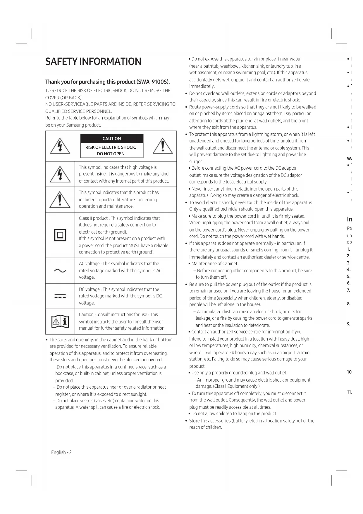 USER MANUAL SWA-9100SEnglish - 3English - 2 SAFETY INFORMATION Thank you for purchasing this product (SWA-9100S). TO REDUCE THE RISK OF ELECTRIC SHOCK, DO NOT REMOVE THE COVER (OR BACK). NO USER-SERVICEABLE PARTS ARE INSIDE. REFER SERVICING TO QUALIFIED SERVICE PERSONNEL. Refer to the table below for an explanation of symbols which may be on your Samsung product. CAUTION RISK OF ELECTRIC SHOCK. DO NOT OPEN. This symbol indicates that high voltage is present inside. It is dangerous to make any kind of contact with any internal part of this product. This symbol indicates that this product has included important literature concerning operation and maintenance. Class II product : This symbol indicates that it does not require a safety connection to electrical earth (ground). If this symbol is not present on a product with a power cord, the product MUST have a reliable connection to protective earth (ground). AC voltage : This symbol indicates that the rated voltage marked with the symbol is AC voltage. DC voltage : This symbol indicates that the rated voltage marked with the symbol is DC voltage. Caution, Consult instructions for use : This symbol instructs the user to consult the user manual for further safety related information.