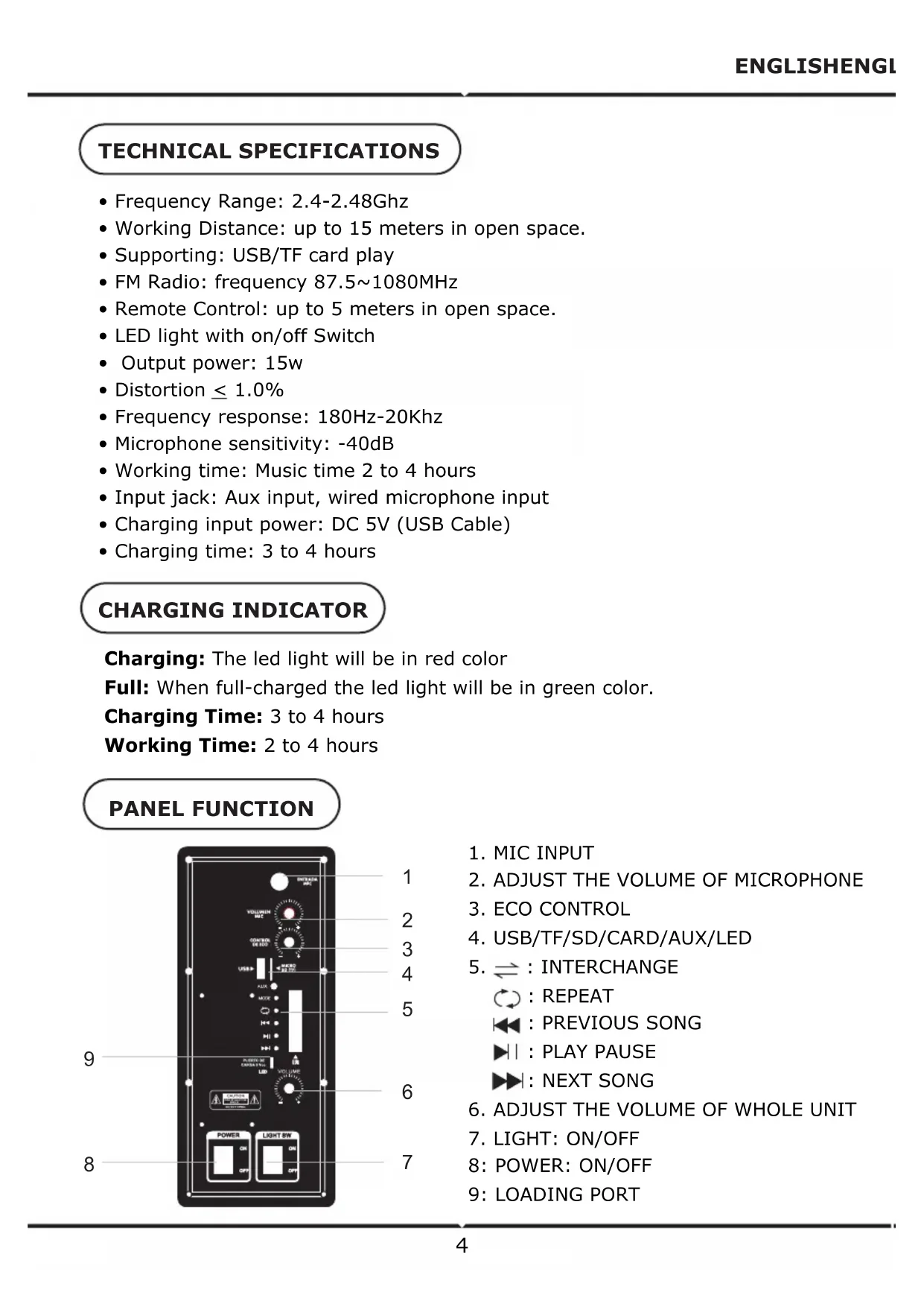 9: LOADING PORT CHARGING INDICATOR Charging: The led light will be in red color Full: When full-charged the led light will be in green color. Charging Time: 3 to 4 hours Working Time: 2 to 4 hours TECHNICAL SPECIFICATIONS