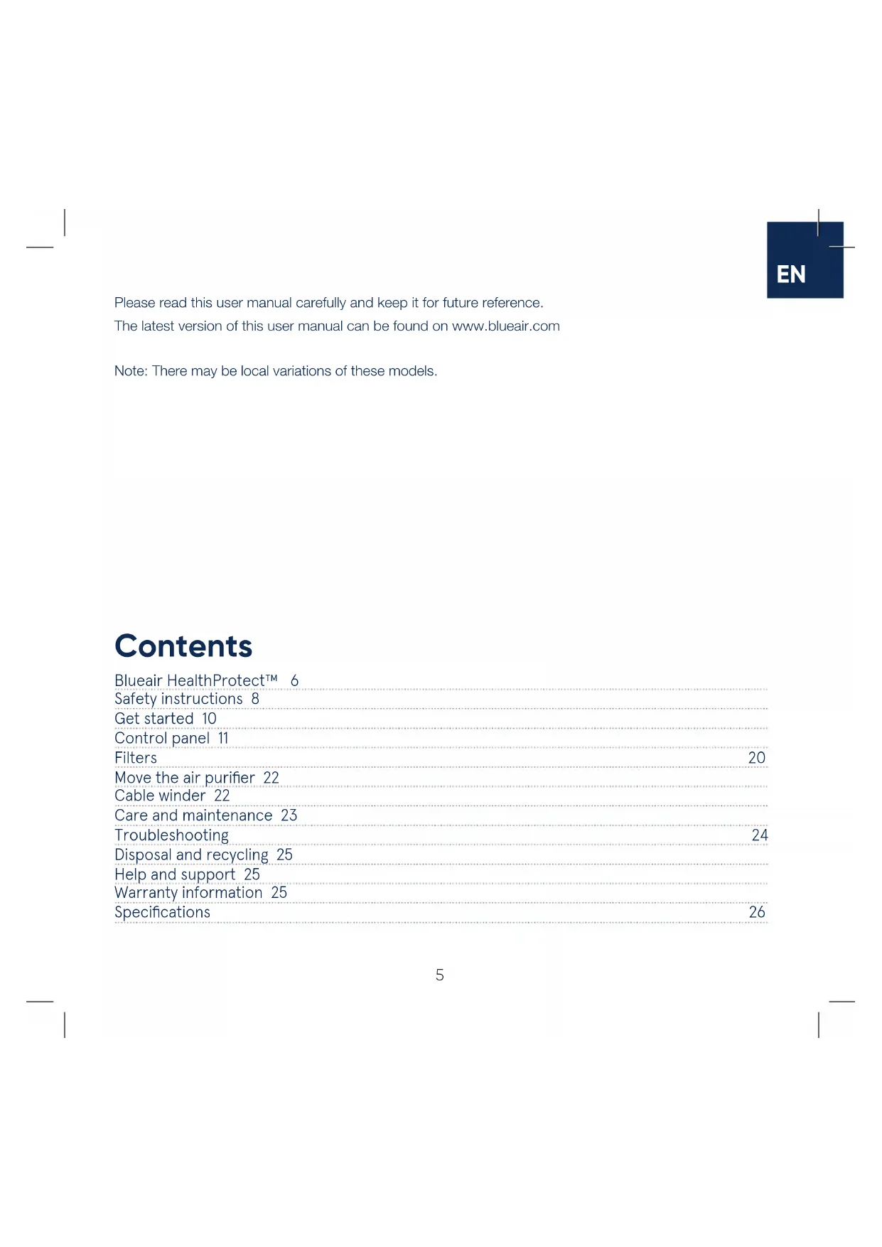 Blueair HealthProtect™ 6 Safety instructions 8 Get started 10 Control panel 11 Filters 20 Move the air purifier 22 Cable winder 22 Care and maintenance 23 Troubleshooting 24 Disposal and recycling 25 Help and support 25 Warranty information 25 Specifications 26 Contents Please read this user manual carefully and keep it for future reference. The latest version of this user manual can be found on www.blueair.com Note: There may be local variations of these models.6 Blueair HealthProtect™ Blueair HealthProtect™ air purifiers are available in three models, the 10-models, the 40-models and the 70-models. All models are Wi-Fi enabled, have a GermShield