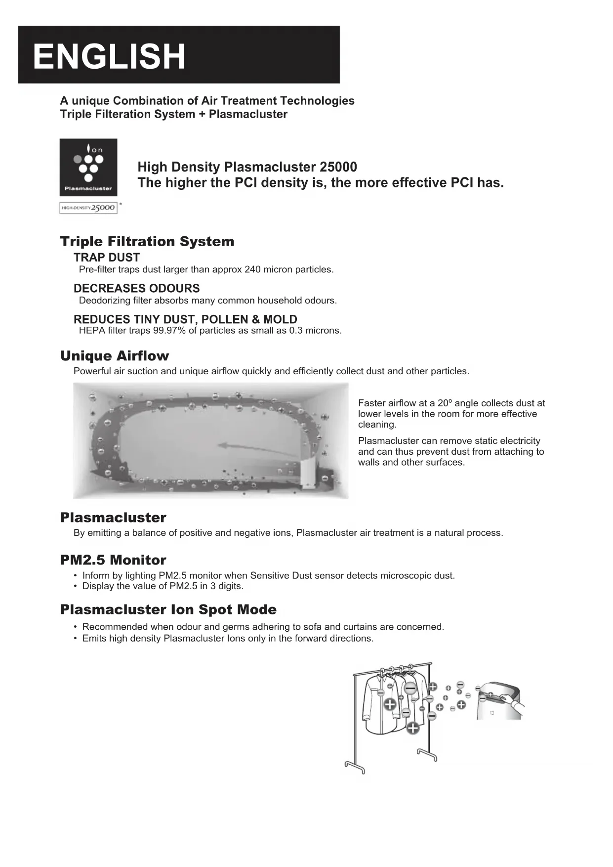 NOTITIESENGLISH A unique Combination of Air Treatment Technologies Triple Filteration System + Plasmacluster High Density Plasmacluster 25000 The higher the PCI density is, the more effective PCI has. Triple Filtration System TRAP DUST Pre-filter traps dust larger than approx 240 micron particles. DECREASES ODOURS Deodorizing filter absorbs many common household odours.