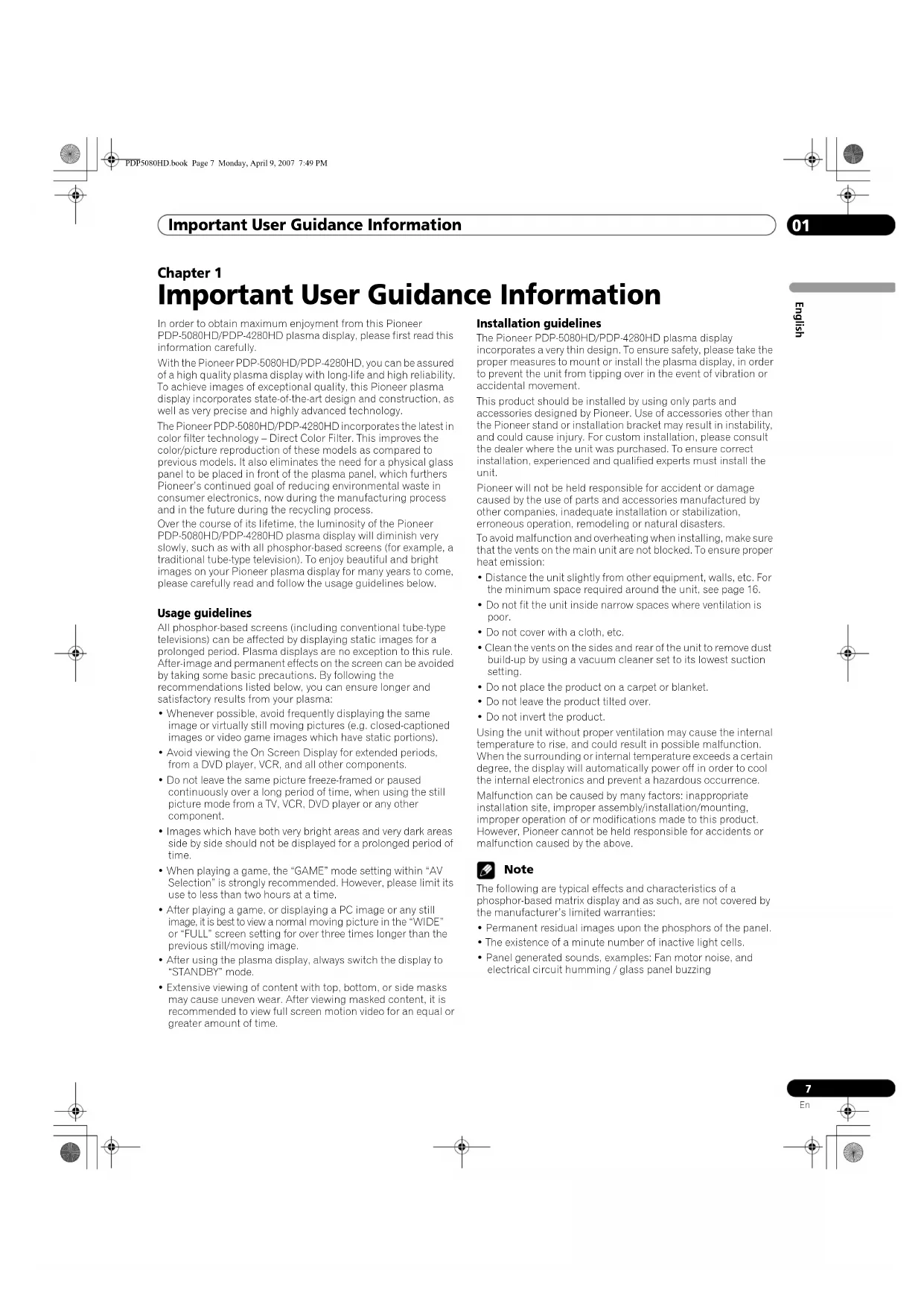 Important User Guidance Information In order to obtain maximum enjoyment from this Pioneer PDP-5080HD/PDP-4280HD plasma display, please first read this information carefully. With the Pioneer PDP-5080HD/PDP-4280HD, you can be assured of a high quality plasma display with long-life and high reliability. To achieve images of exceptional quality, this Pioneer plasma display incorporates state-of-the-art design and construction, as well as very precise and highly advanced technology. The Pioneer PDP-5080HD/PDP-4280HD incorporates the latest in color filter technology – Direct Color Filter. This improves the color/picture reproduction of these models as compared to previous models. It also eliminates the need for a physical glass panel to be placed in front of the plasma panel, which furthers Pioneer’s continued goal of reducing environmental waste in consumer electronics, now during the manufacturing process and in the future during the recycling process. Over the course of its lifetime, the luminosity of the Pioneer PDP-5080HD/PDP-4280HD plasma display will diminish very slowly, such as with all phosphor-based screens (for example, a traditional tube-type television). To enjoy beautiful and bright images on your Pioneer plasma display for many years to come, please carefully read and follow the usage guidelines below. Usage guidelines All phosphor-based screens (including conventional tube-type televisions) can be affected by displaying static images for a prolonged period. Plasma displays are no exception to this rule. After-image and permanent effects on the screen can be avoided by taking some basic precautions. By following the recommendations listed below, you can ensure longer and satisfactory results from your plasma: