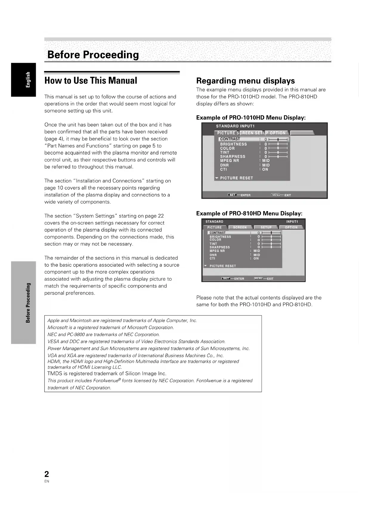 English Before Proceeding Before Proceeding How to Use This Manual This manual is set up to follow the course of actions and operations in the order that would seem most logical for someone setting up this unit. Once the unit has been taken out of the box and it has been confirmed that all the parts have been received (page 4), it may be beneficial to look over the section “Part Names and Functions” starting on page 5 to become acquainted with the plasma monitor and remote control unit, as their respective buttons and controls will be referred to throughout this manual. The section “Installation and Connections” starting on page 10 covers all the necessary points regarding installation of the plasma display and connections to a wide variety of components. The section “System Settings” starting on page 22 covers the on-screen settings necessary for correct operation of the plasma display with its connected components. Depending on the connections made, this section may or may not be necessary. The remainder of the sections in this manual is dedicated to the basic operations associated with selecting a source component up to the more complex operations associated with adjusting the plasma display picture to match the requirements of specific components and personal preferences. Apple and Macintosh are registered trademarks of Apple Computer, Inc.Microsoft is a registered trademark of Microsoft Corporation.NEC and PC-9800 are trademarks of NEC Corporation.VESA and DDC are registered trademarks of Video Electronics Standards Association.Power Management and Sun Microsystems are registered trademarks of Sun Microsystems, Inc.VGA and XGA are registered trademarks of International Business Machines Co., Inc.HDMI, the HDMI logo and High-Definition Multimedia Interface are trademarks or registeredtrademarks of HDMI Licensing LLC. TMDS is registered trademark of Silicon Image Inc. This product includes FontAvenue fonts licensed by NEC Corporation. FontAvenue is a registeredtrademark of NEC Corporation. Regarding menu displays The example menu displays provided in this manual are those for the PRO-1010HD model. The PRO-810HD display differs as shown: Example of PRO-1010HD Menu Display:
